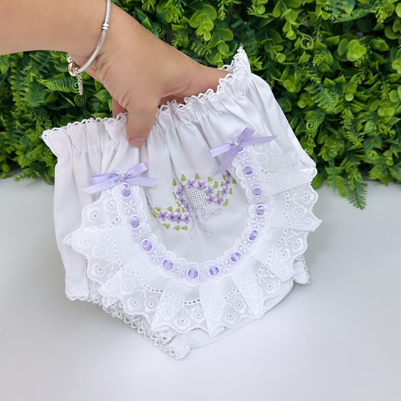 Calcinha em tricoline 100% algodão, com toque macio e respirável. Detalhes encantadores em bico de cambraia, bordado manual, fita de cetim e elástico suave nas perninhas com acabamento delicado.