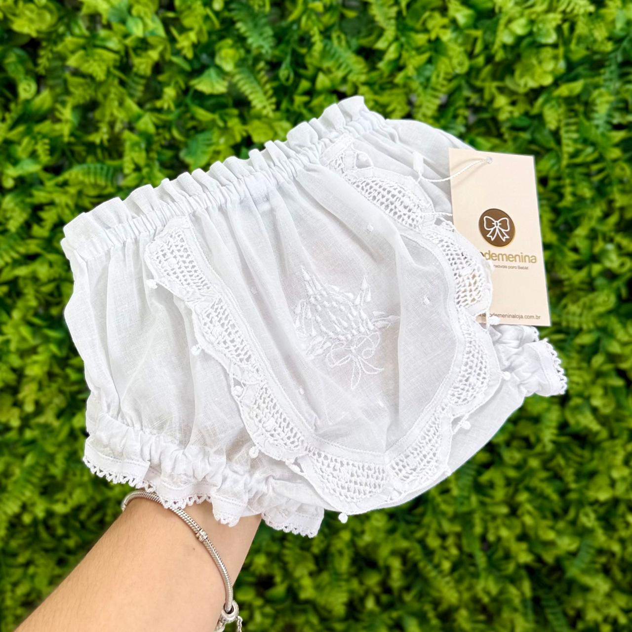 - Calcinha tapa-fralda infantil confeccionada em tecido leve e delicado, na cor branca, com acabamento artesanal. Possui elástico suave na cintura e nas perninhas, garantindo conforto e ajuste perfeito ao bebê. O modelo conta com renda vazada e bordado floral no centro.