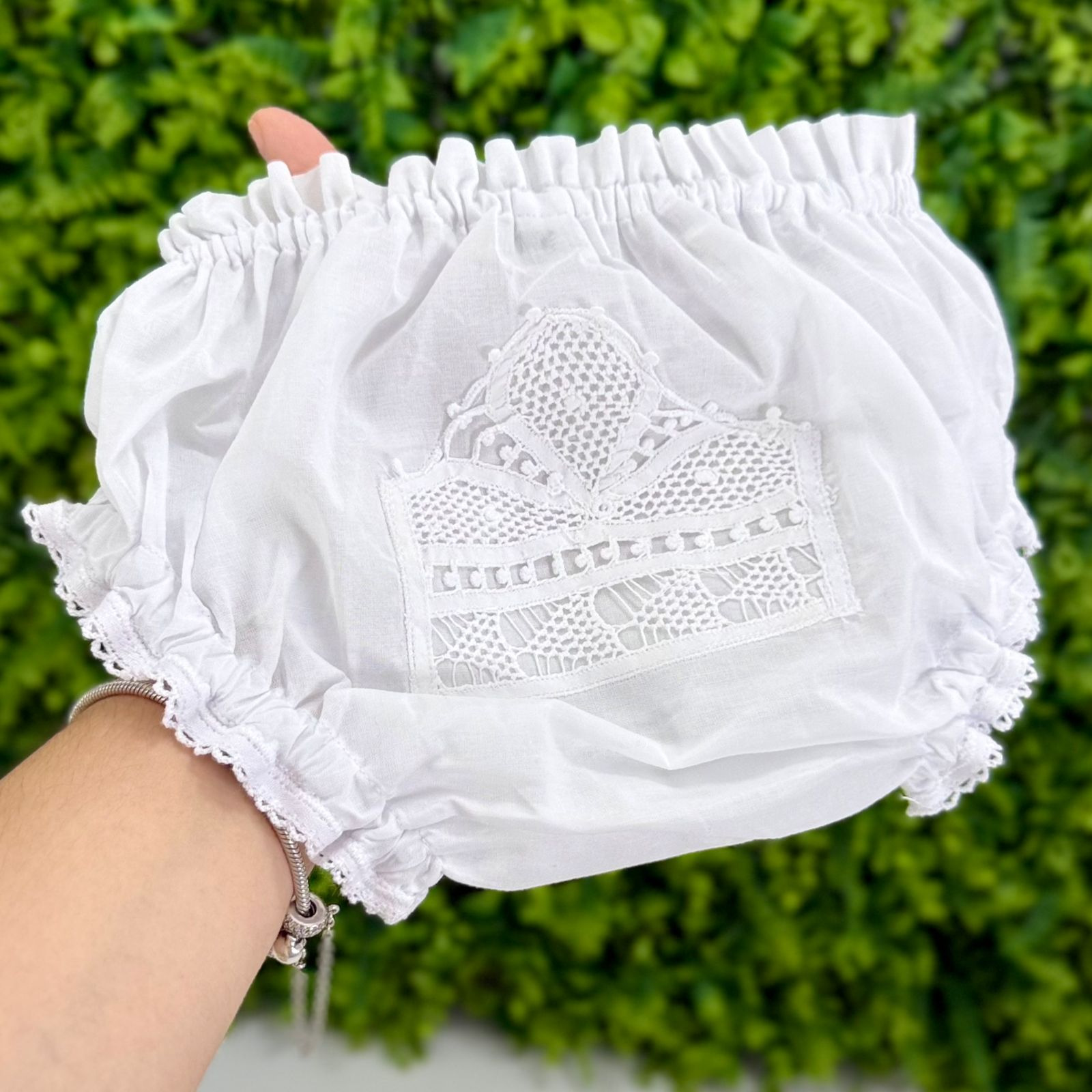 • Peça delicada e charmosa em tecido branco leve, com acabamento em elástico suave na cintura e nas perninhas, garantindo conforto e ótimo ajuste. Possui detalhe central em renda delicada, que acrescenta um toque clássico e elegante.