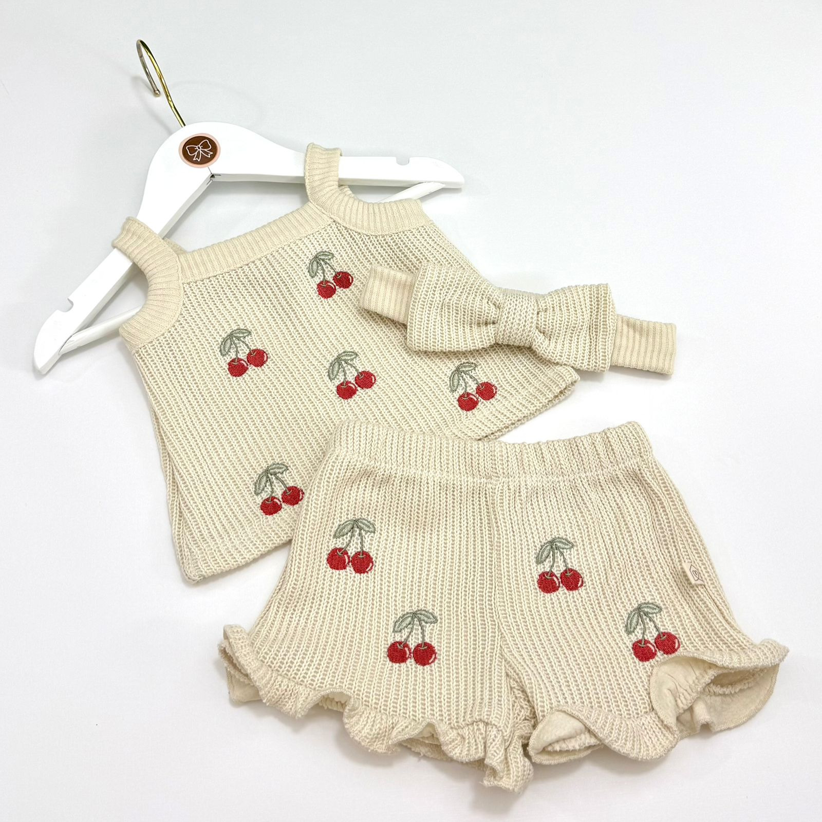 Conjunto em tricô macio e delicado, composto por blusinha regata, short com babado e faixa de cabelo com laço. As peças possuem bordados de cerejinhas que trazem um toque charmoso e atemporal. Confortável e estiloso.