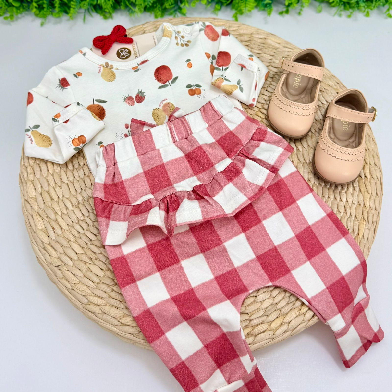 A calça complementa o look com estampa xadrez em tons de vermelho, contando com cós elástico e um charmoso laço frontal, garantindo ajuste perfeito e um visual ainda mais fofo.