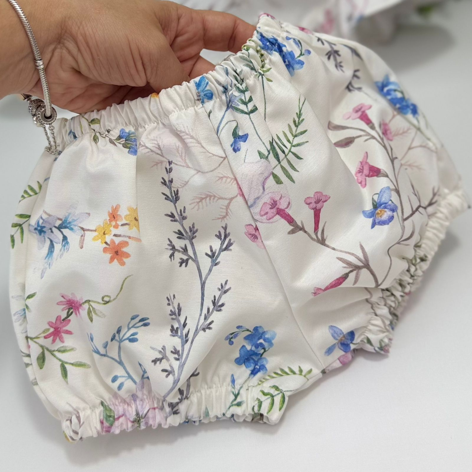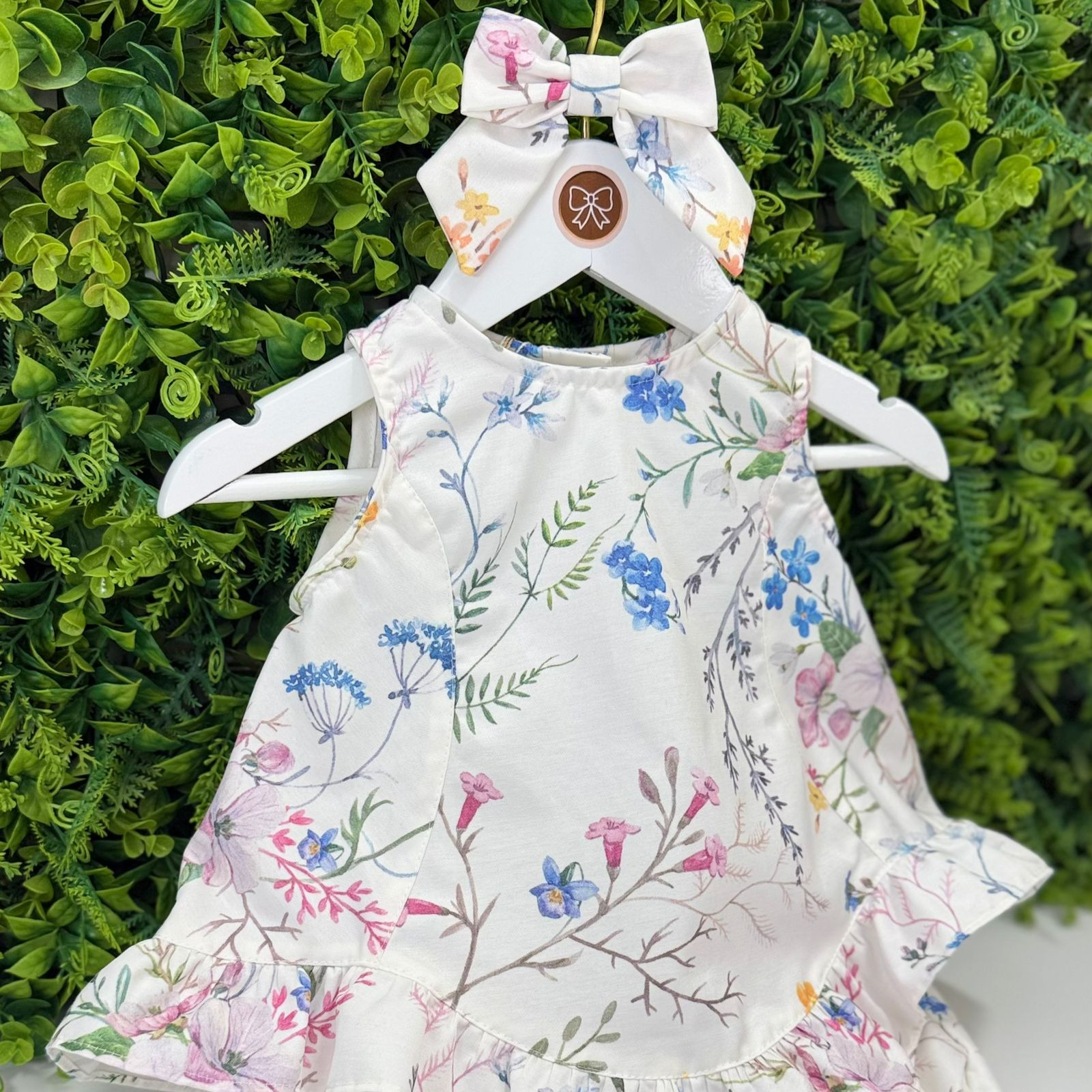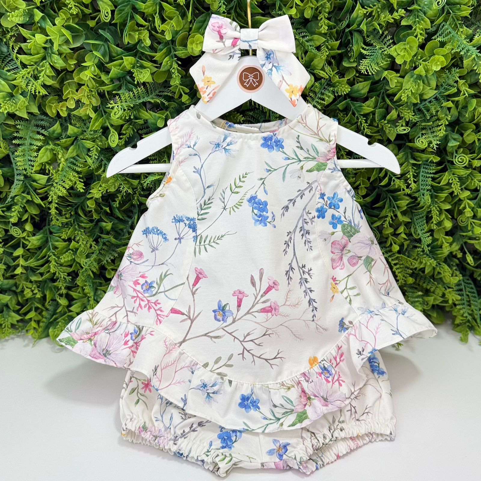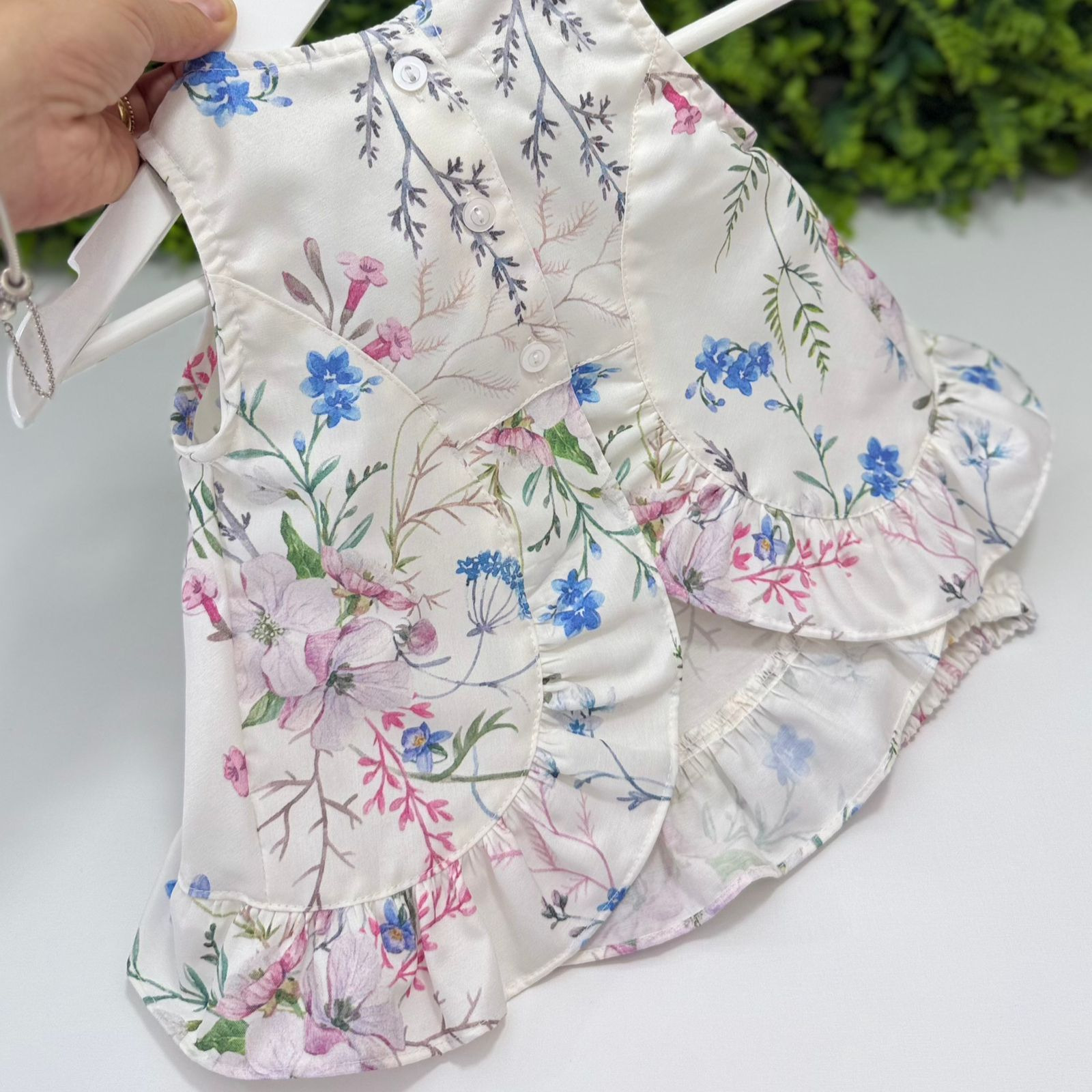 Conjuntinho infantil cheio de charme, composto por batinha sem mangas com botões nas costas e shortinho com elástico na cintura e nas perninhas. Confeccionado em tecido leve de algodão e poliéster, traz uma estampa delicada de flores e raminhos, perfeita para dias fresquinhos e confortáveis.