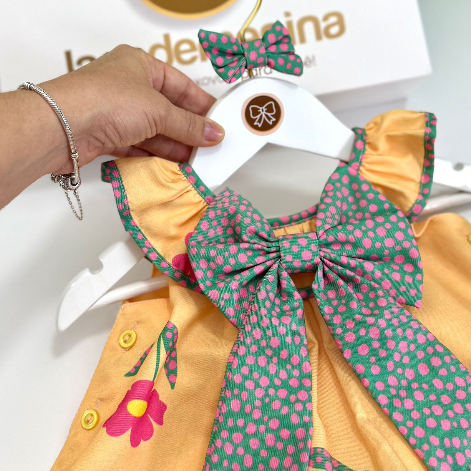 O conjunto acompanha laço para o cabelo no bico de pato e calcinha combinando, criando um look completo e cheio de charme. Ideal para passeios, festas ou momentos especiais uma escolha perfeita para iluminar o dia da sua princesa!