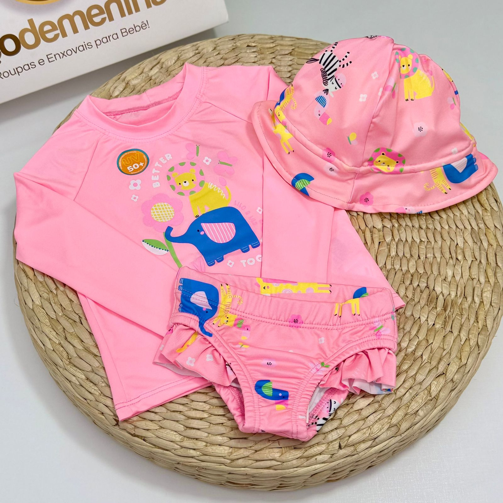 Nosso conjunto infantil praiano é composto por uma camisa com proteção UV de mangas longas, perfeita para proteger a pele delicada das crianças contra os raios solares, uma calcinha com estampa safari super fofa, e um chapéu combinando que completa o visual com charme e estilo.