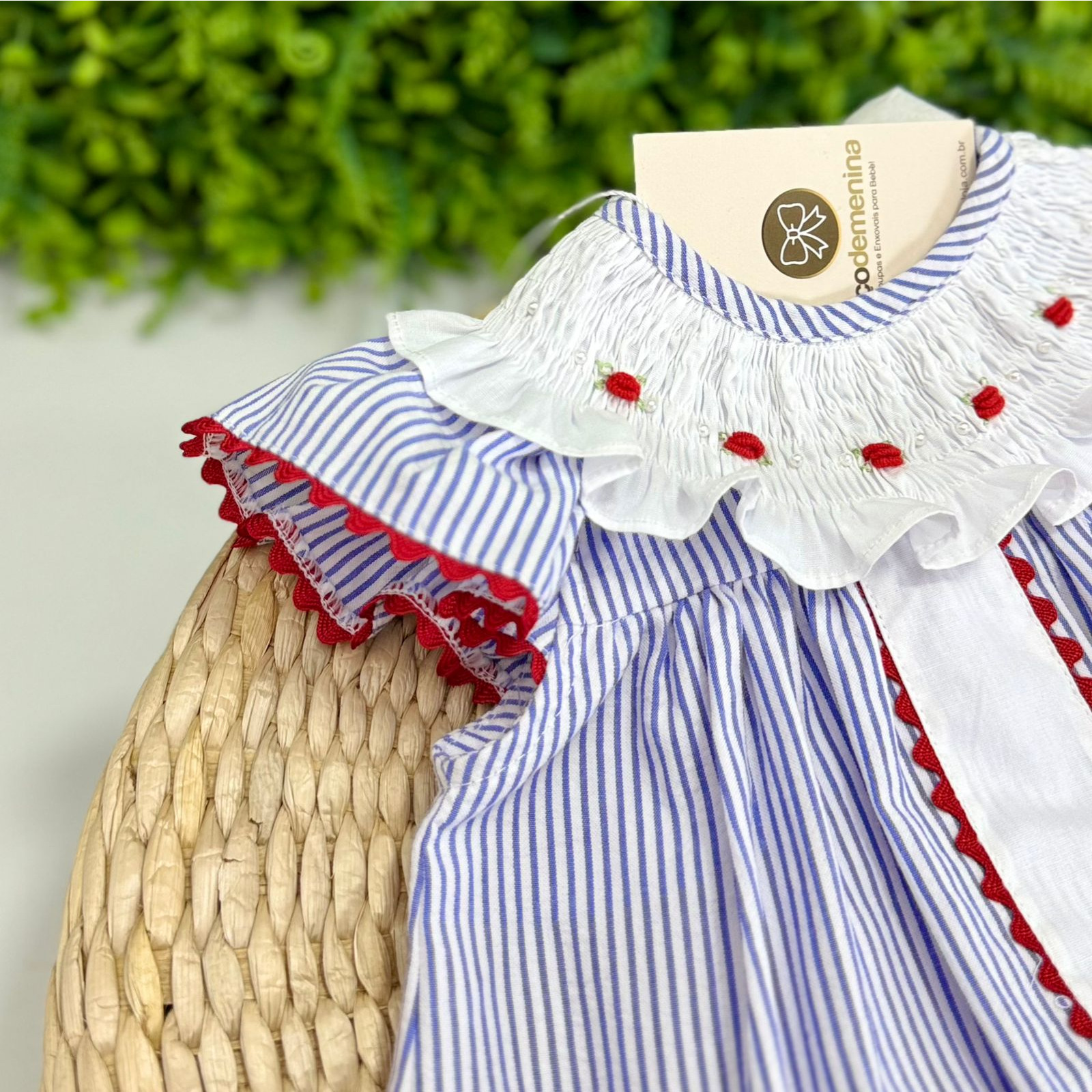 Conjunto infantil confeccionado em tecido 100% algodão, com uma delicada estampa listrada em azul. Acompanha uma charmosa batinha com modelagem mais soltinha, gola estilo casinha de abelha, enriquecida com bordados e aplicação de pérolas, além de um shortinho com bolsos funcionais e cintura elástica para mais conforto. Ideal para deixar as pequenas ainda mais encantadoras!