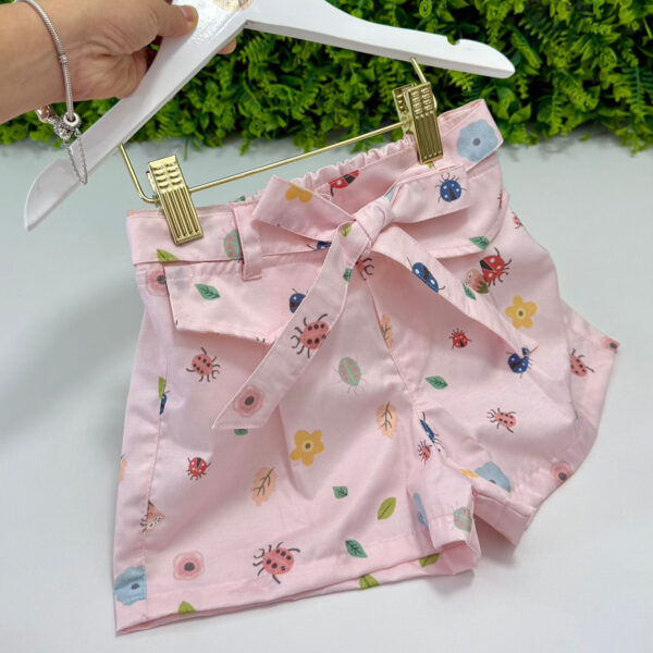 Conjunto encantador confeccionado em tecido leve (61% algodão e 39% poliéster), na delicada cor rosa claro e estampa fofa de joaninhas. A camisa conta com um charmoso laço nas costas e abertura que traz um toque especial ao look.