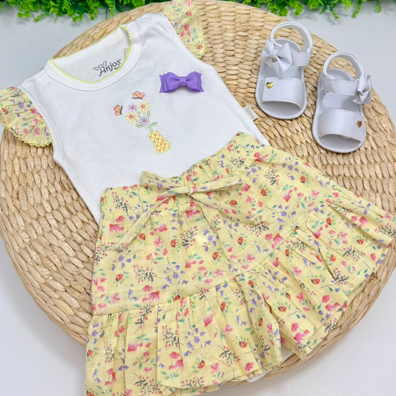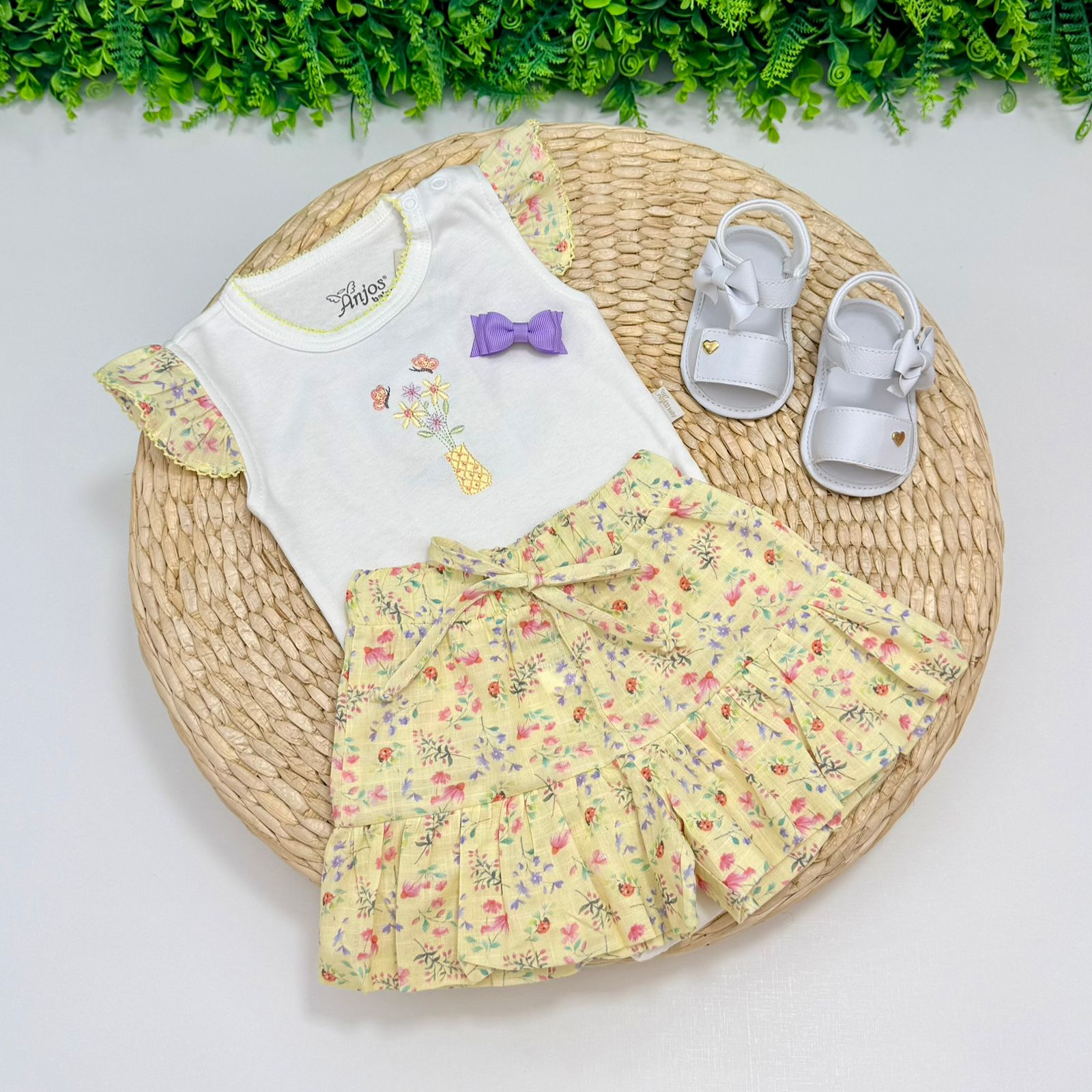 Conjuntinho feminino da marca Anjos Baby, pensado para trazer conforto e charme para as pequenas! O body branco de mangas curtas apresenta uma delicada estampa de jardim, com bordado no busto que acrescenta um toque de sofisticação. Conta com botões na entreperna, facilitando na hora de vestir e trocar a fralda. O conjunto acompanha um shortinho combinando com a mesma estampa de jardim, garantindo um look harmonioso e encantador para qualquer ocasião. Perfeito para dias de passeio, festas ou para deixar o dia a dia das meninas ainda mais cheio de estilo e fofura!