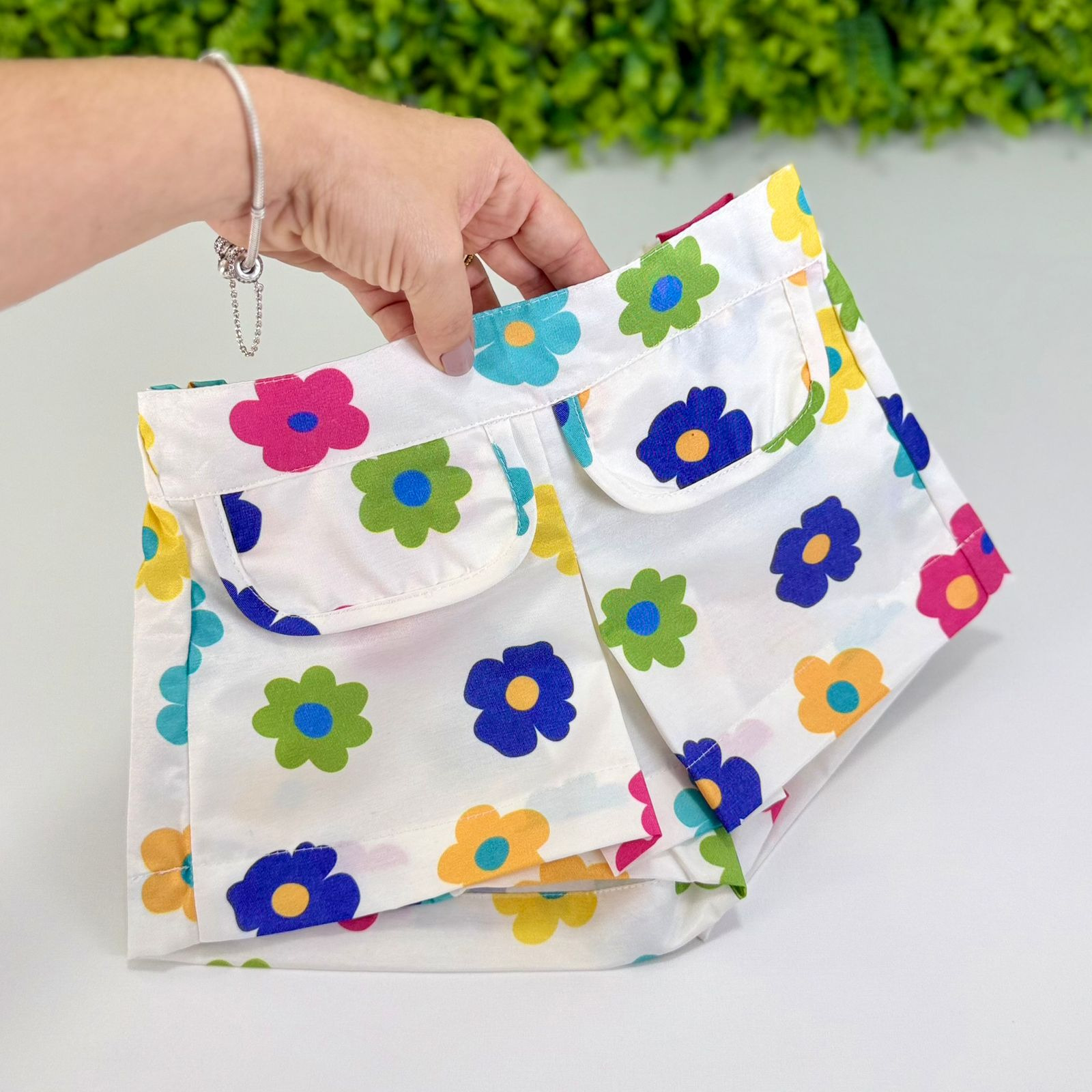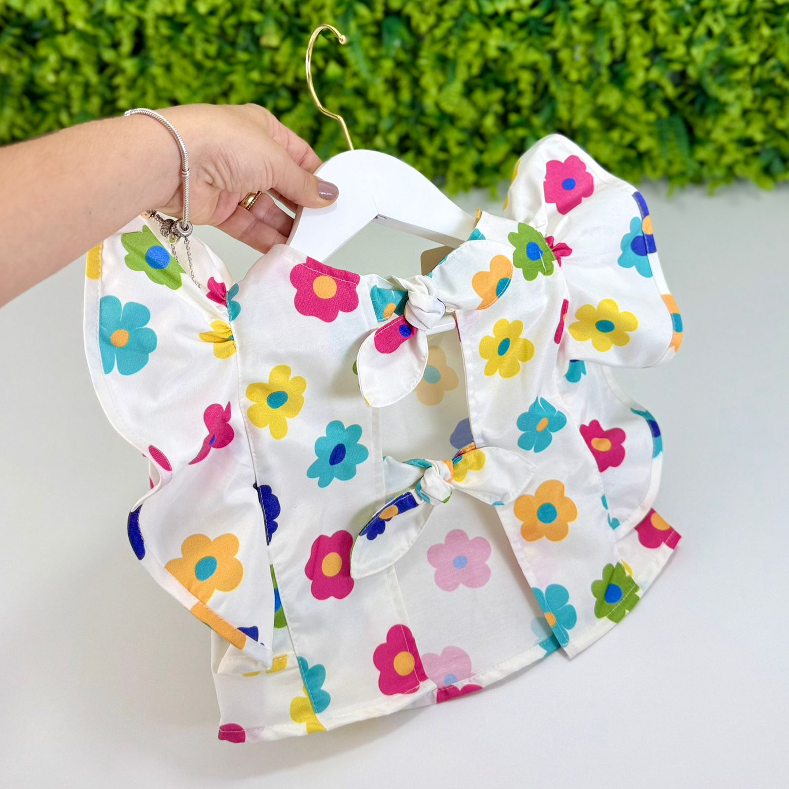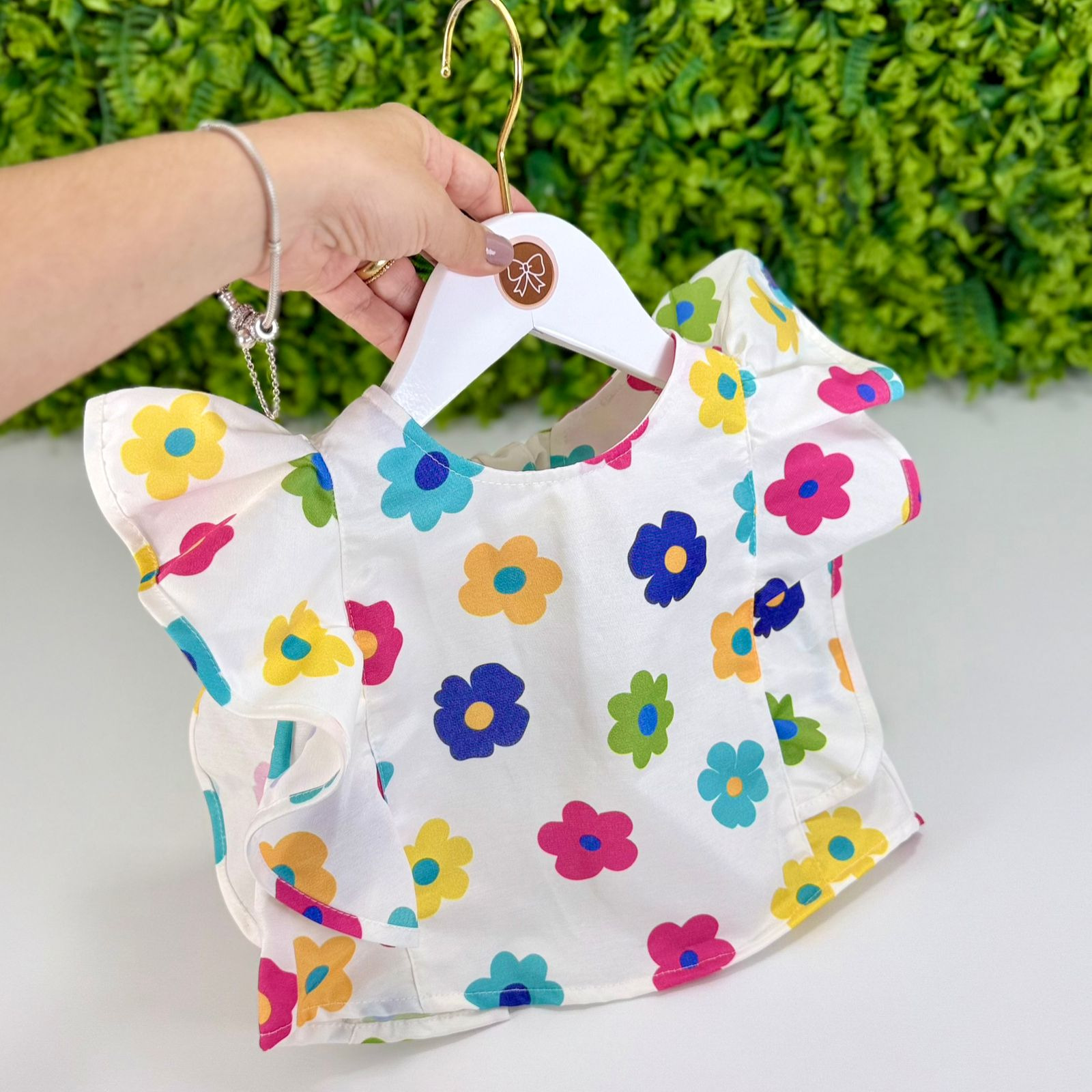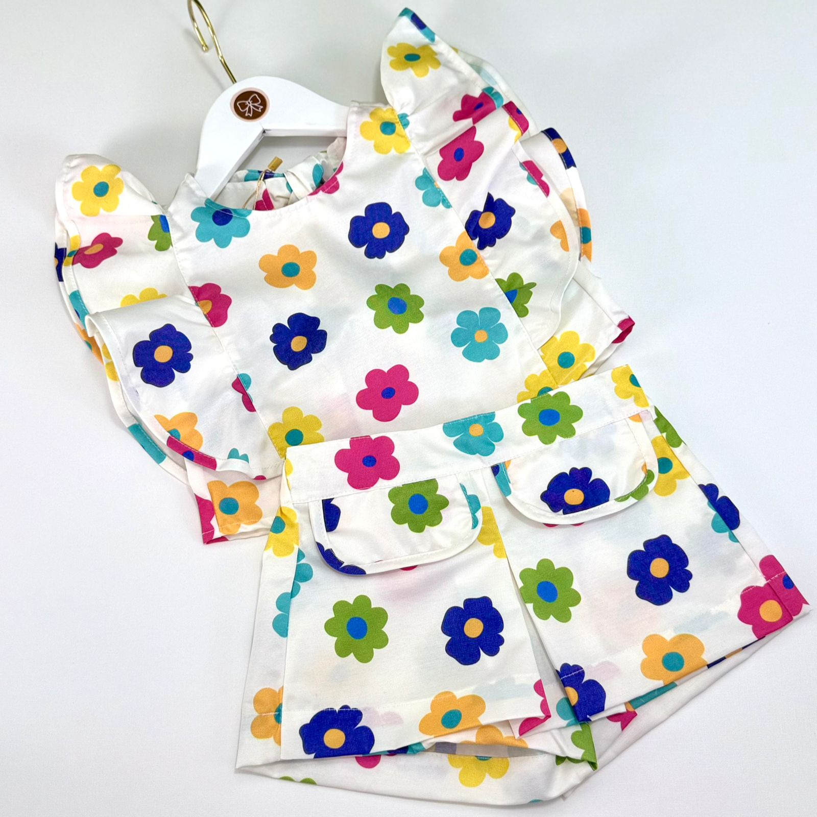 Esse conjuntinho é puro amor: a batinha com estampa delicada de florzinhas e laços nas costas traz toda a doçura que a infância merece, Já o shortinho estilo short saia completa o visual com conforto e liberdade pra correr, brincar e se divertir à vontade!