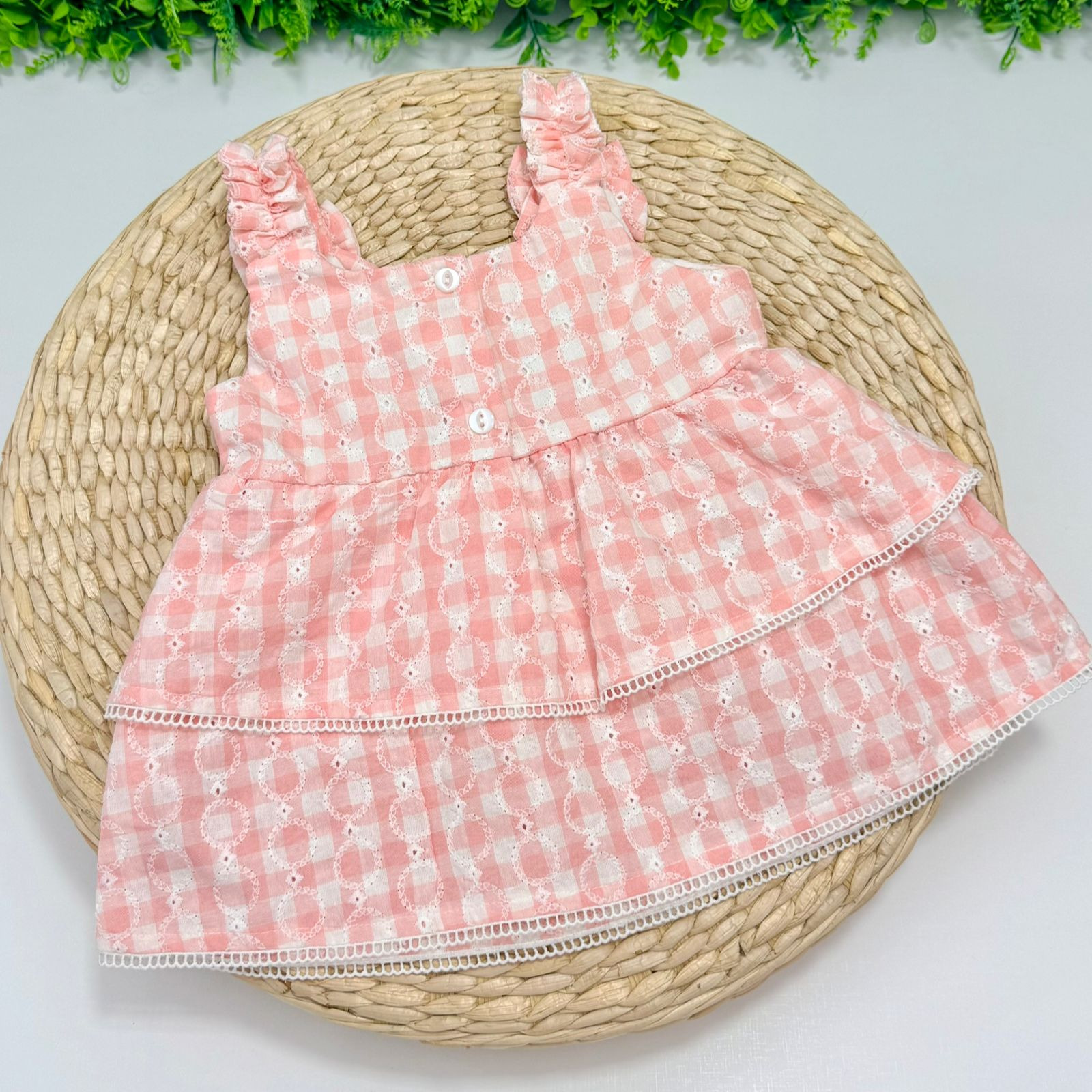 Conjunto Anjos Baby®: um look encantador e cheio de delicadeza. A batinha em estampa xadrez rosa traz um toque romântico, enriquecida por um refinado bordado de cambraia que percorre todo o seu comprimento. As alcinhas com lacinhos aplicados acrescentam ainda mais charme e feminilidade à peça.