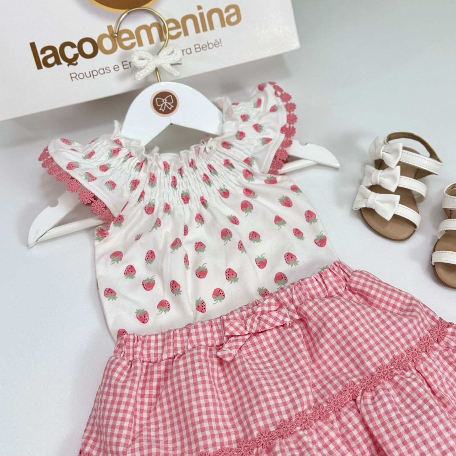 O look é composto por um body em tecido leve, com estampa fofa de moranguinhos, mangas com babadinhos. A saia em tecido xadrez rosa complementa perfeitamente a produção, com modelagem soltinha, e detalhe de laço na cintura, garantindo um visual encantador e fresquinho.