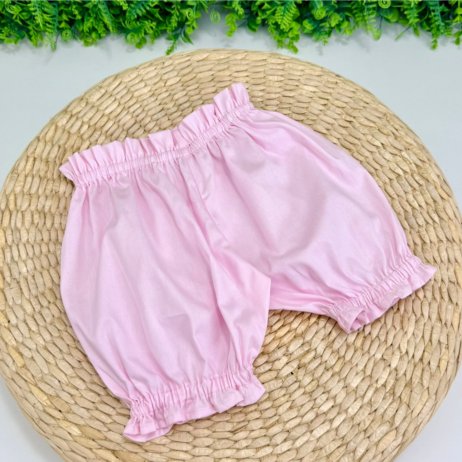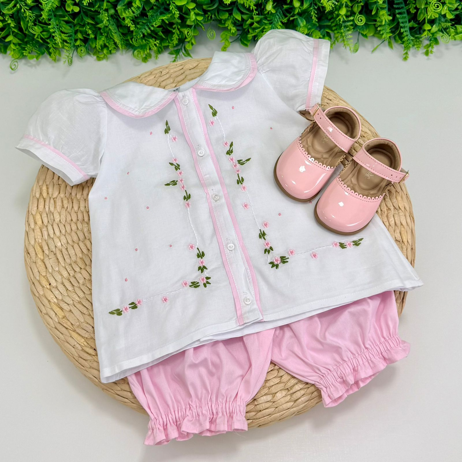 Conjunto infantil encantador, com camisa branca bordada em florzinhas, com short (estilo fofinho) na cor rosa combinando. Perfeito para ocasiões especiais com muito conforto e charme.