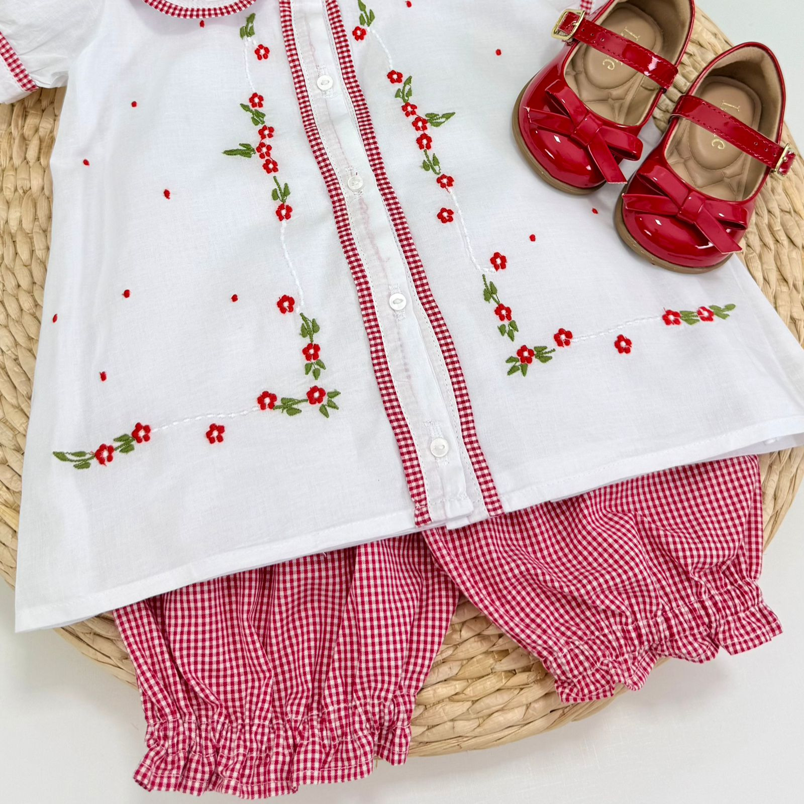 Conjunto infantil encantador, com camisa branca bordada em florzinhas, com short (estilo fofinho) na estampa xadrez. Perfeito para ocasiões especiais com muito conforto e charme.