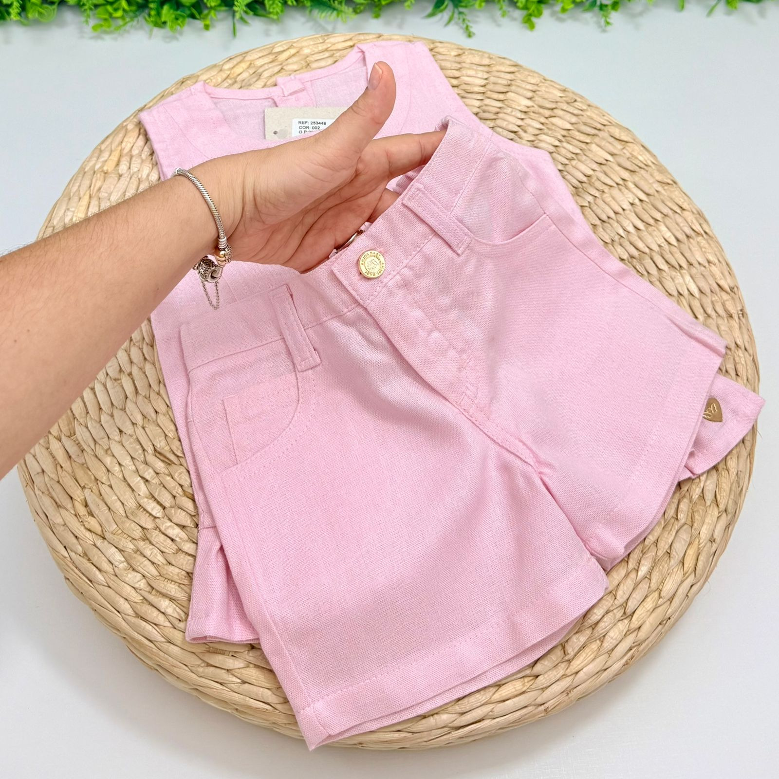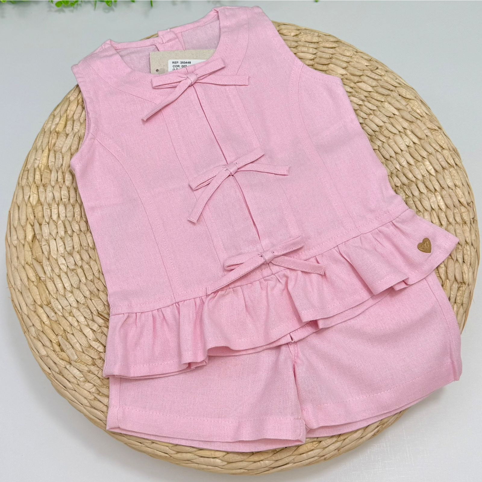 Conjuntinho infantil feminino confeccionado em tecido de linho, na cor rosa, proporcionando conforto e leveza para os dias mais quentes. Acompanha uma delicada batinha sem mangas, com acabamento em babadinhos na barra que adicionam um toque de charme ao visual. Possui fechamento por botões nas costas, facilitando na hora de vestir, além de uma linda aplicação de três lacinhos na parte frontal, que trazem um detalhe lúdico e encantador. Um look fofo, confortável e ideal para deixar as pequenas ainda mais estilosas!