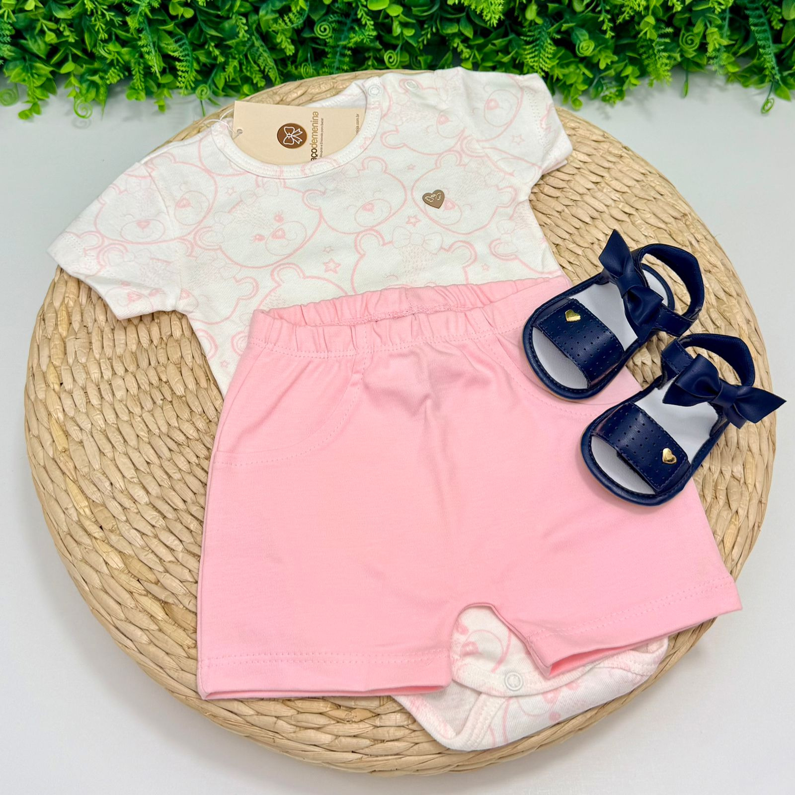 - Conjunto composto por um body com estampa de ursinhos e um short na cor rosa. Ambos são confeccionados em tecido 100% algodão, para melhor conforto do bebê.
