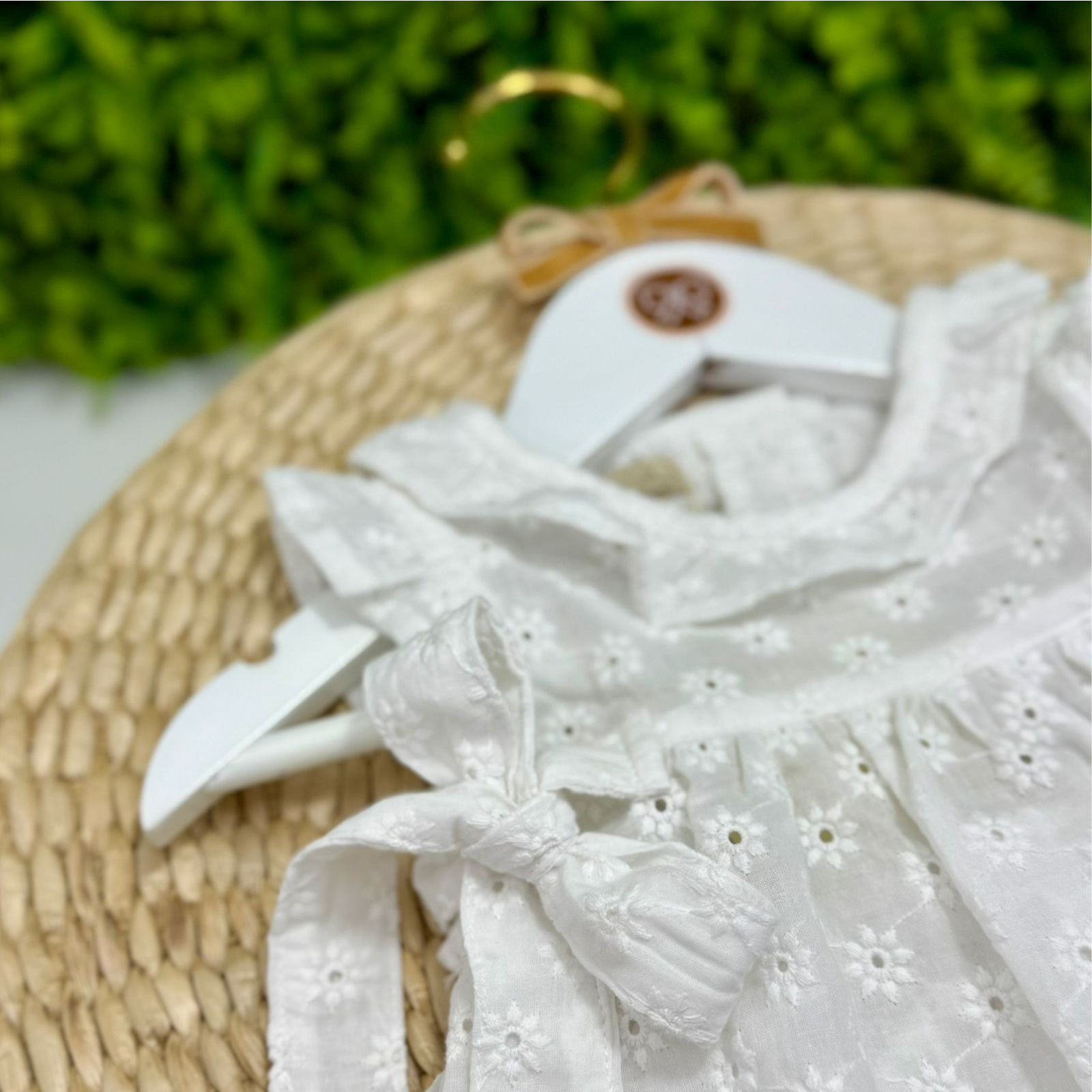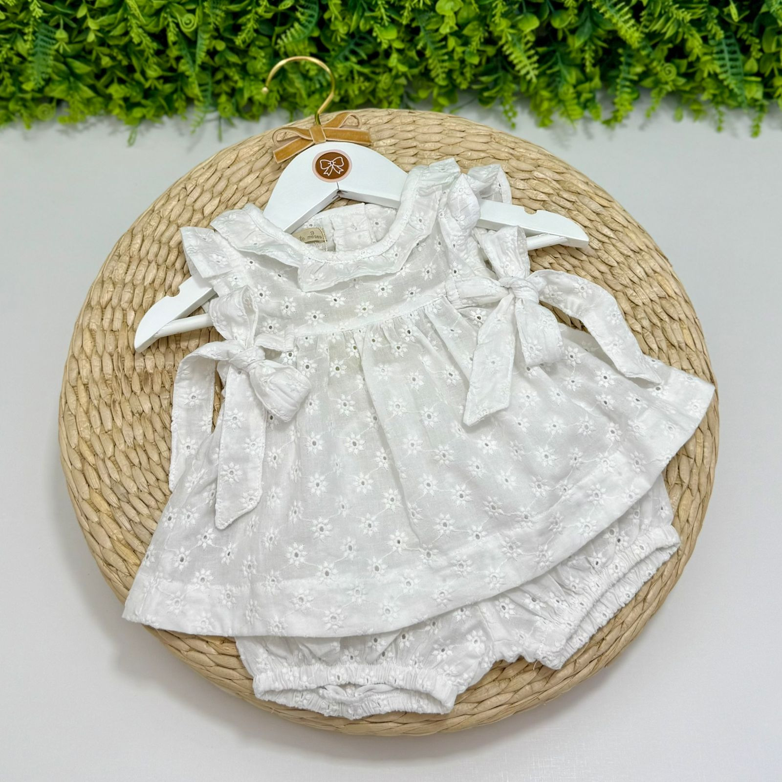 Conjuntinho composto por um shortinho e uma batinha, ambos confeccionado em cambraia de lese na cor branca. Batinha possui laços laterais para melhor ajuste na criança e botões na parte de trás para auxiliar na hora da troca.