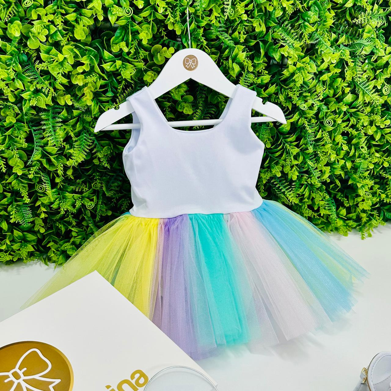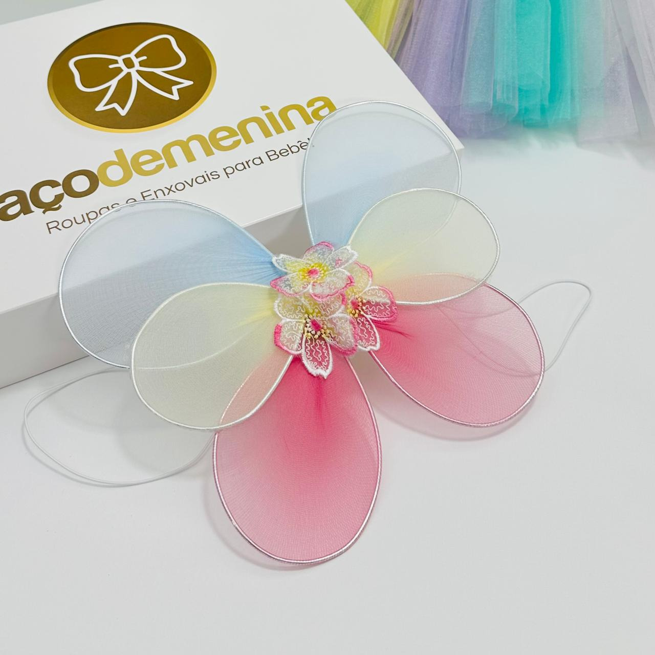 O vestido tem corpinho branco confortável e saia rodada em tule multicolorido, com tons pastel que lembram confetes e arco-íris. O look fica completo com asas de fadinha delicadas, perfeitos para arrasar nos bloquinhos, festas e fotos de Carnaval.