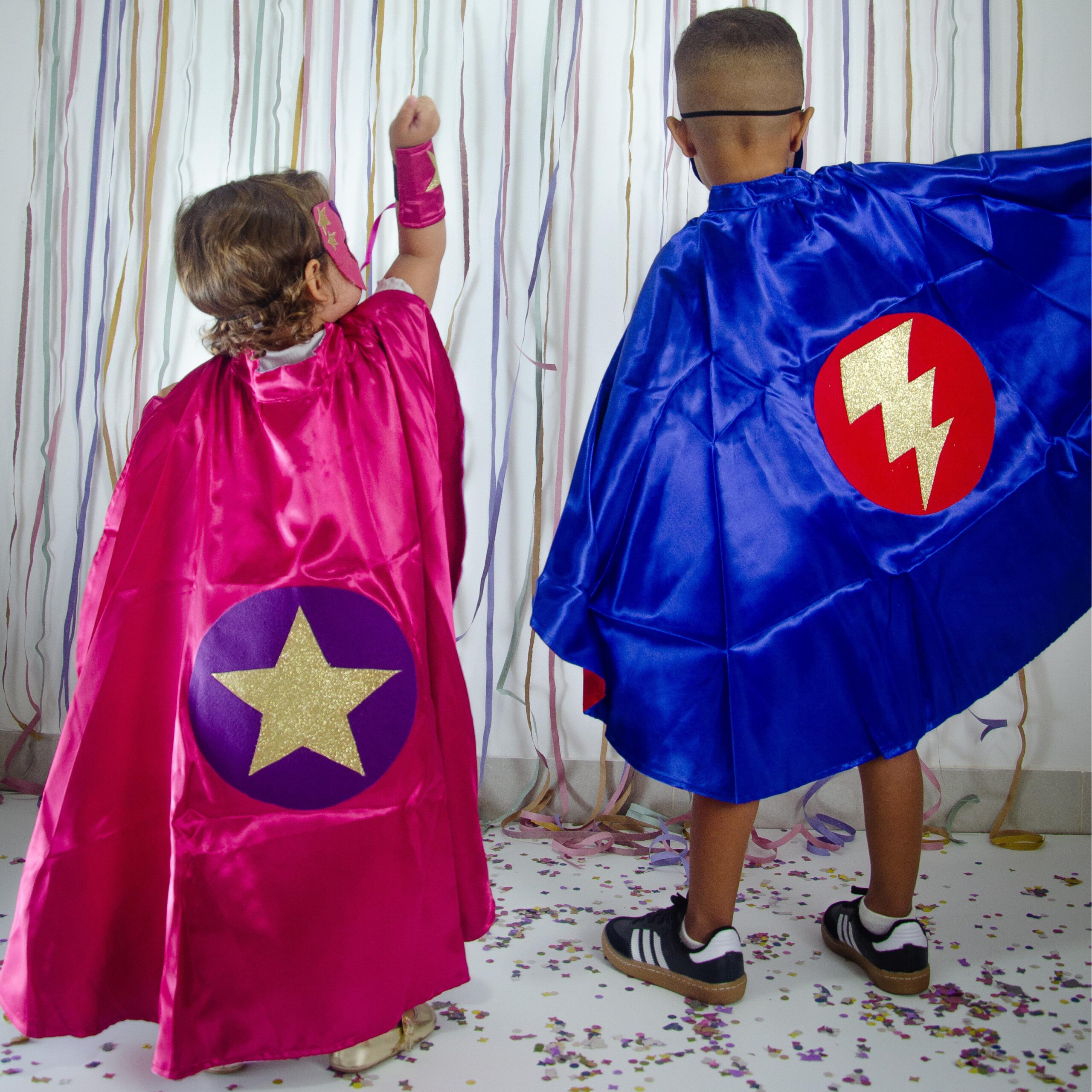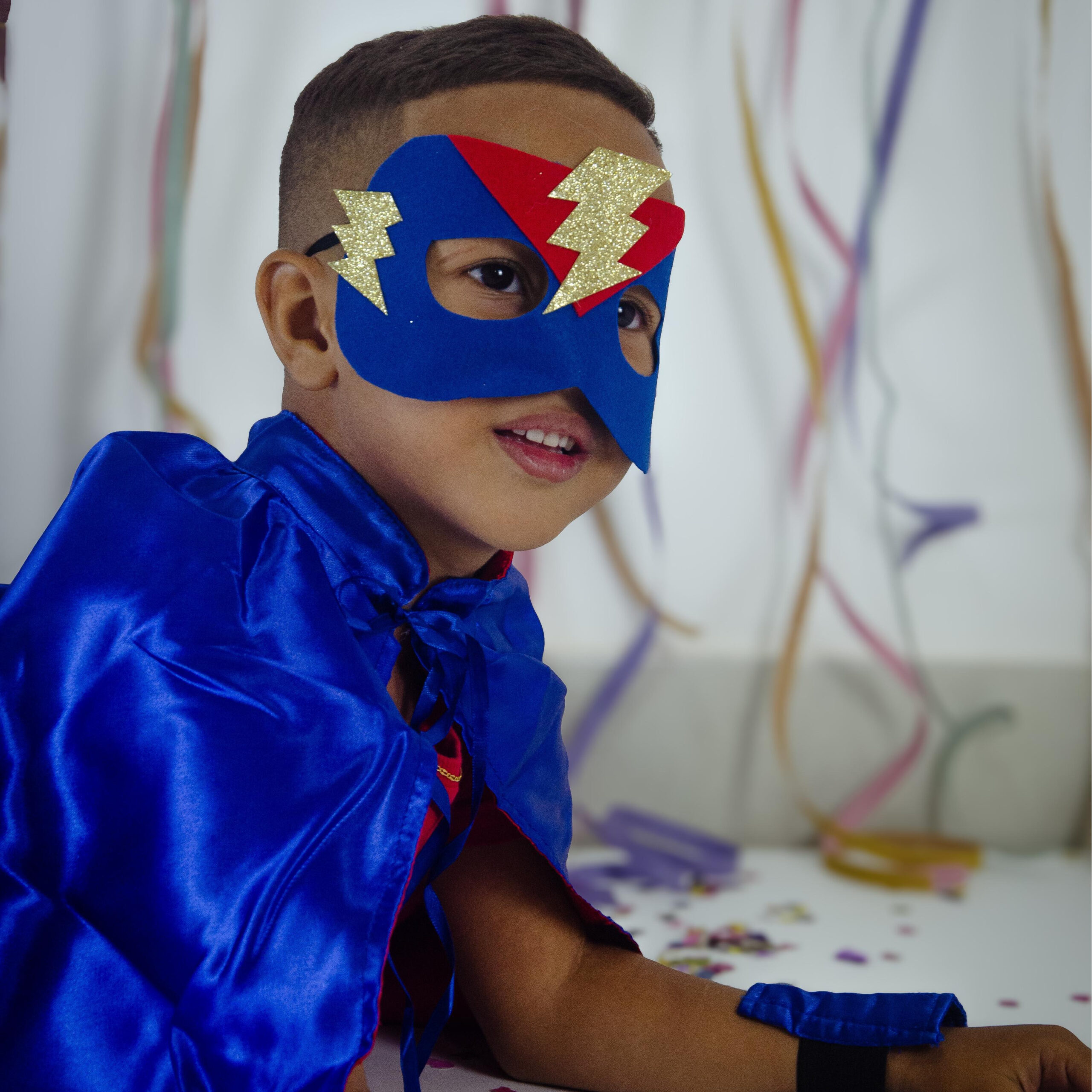 Fantasia infantil de herói na cor azul, composta por capa, máscara, cinto e dois braceletes com símbolo de raio, perfeita para salvar o dia com muito estilo e poder.