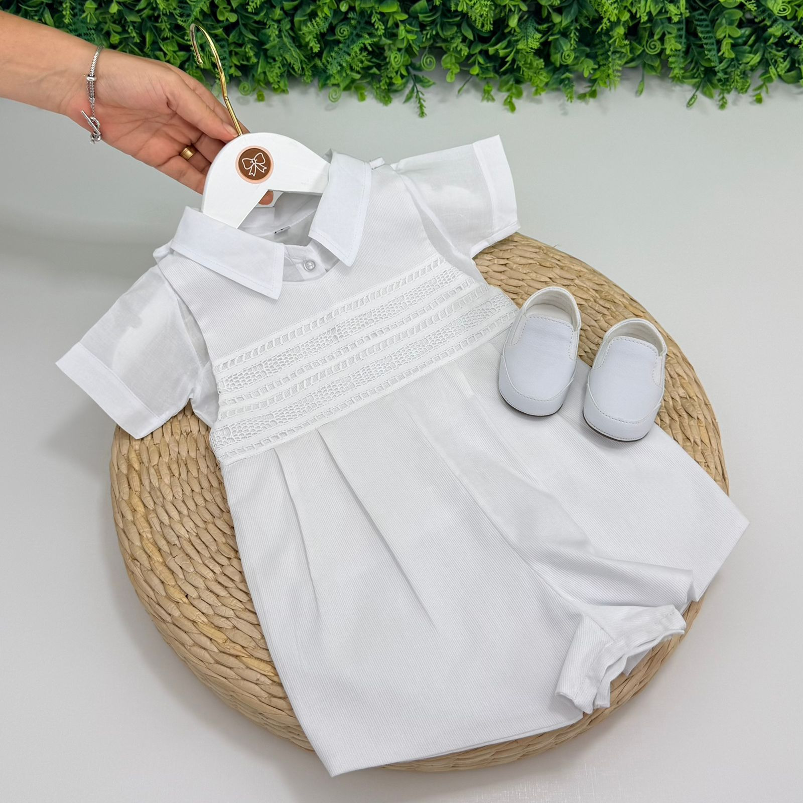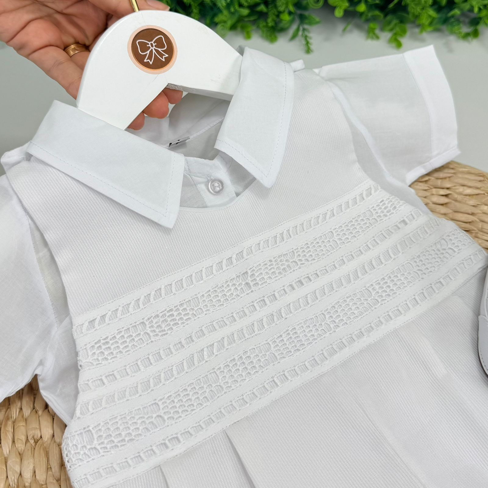 Conjunto composto por uma jardineira sem mangas, confeccionada em tecido branco de excelente qualidade, com delicados detalhes em entremeios no peito, que trazem charme e sofisticação à peça. Acompanha camisa branca com manguinhas e gola clássica, garantindo um visual elegante e tradicional.