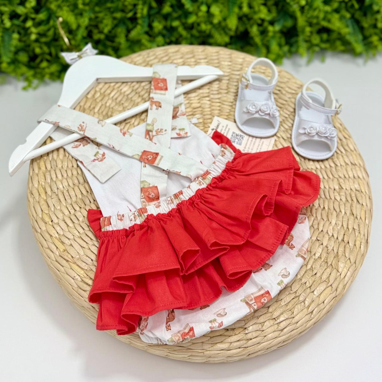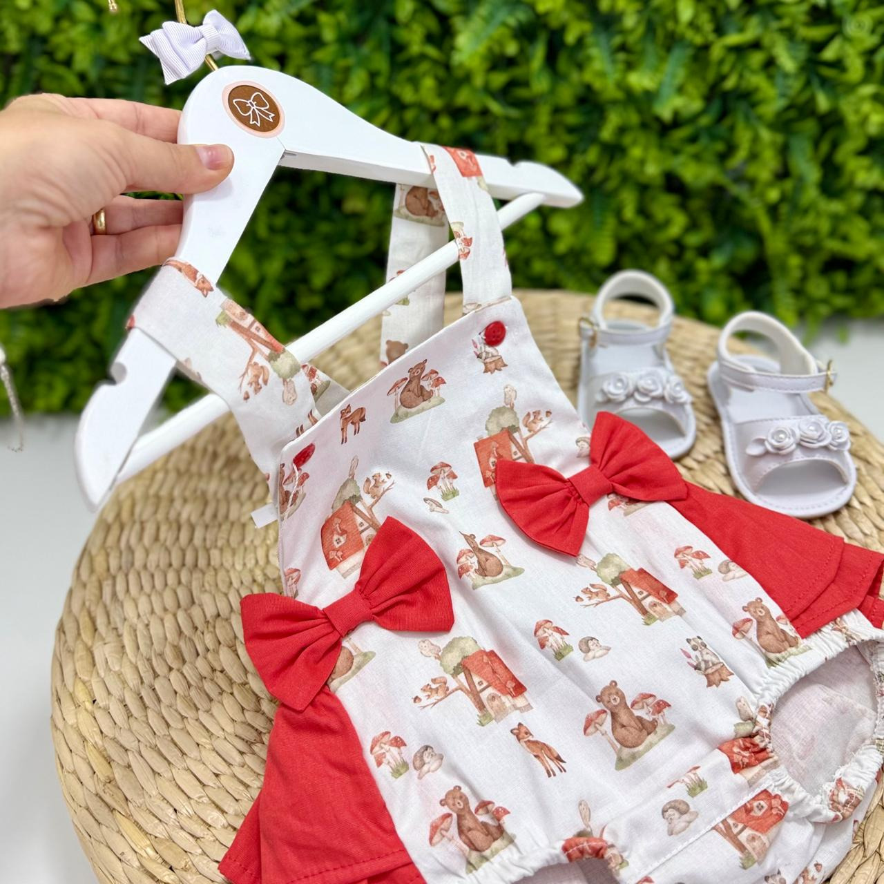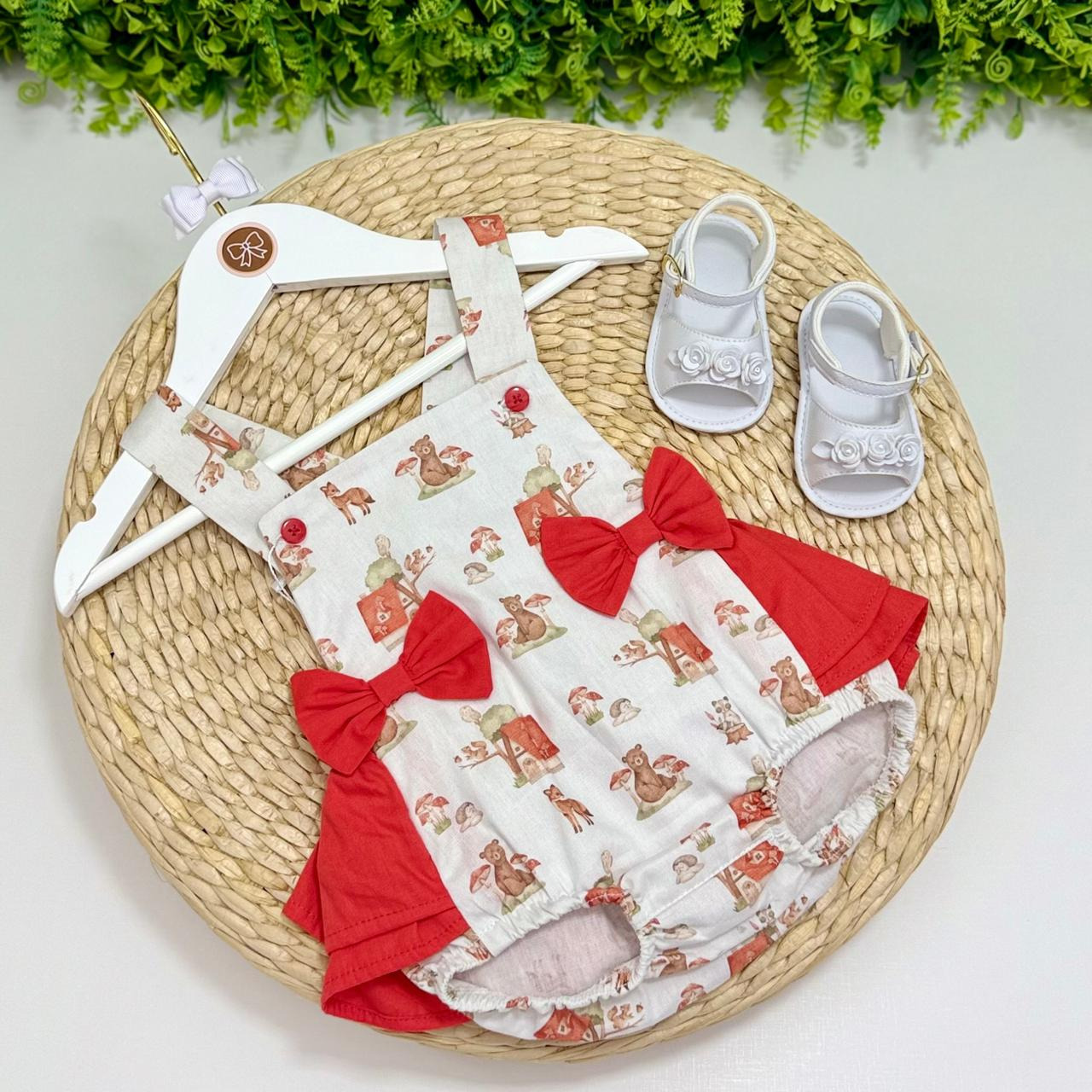Jardineira infantil tem uma estampa super fofa de bosque e laços frontais que deixam tudo ainda mais charmoso. O tecido é leve, fresquinho e confortável, com alças ajustáveis e elástico nas perninhas, perfeito para acompanhar a bebê em todos os momentos. Um look apaixonante para as pequenas!