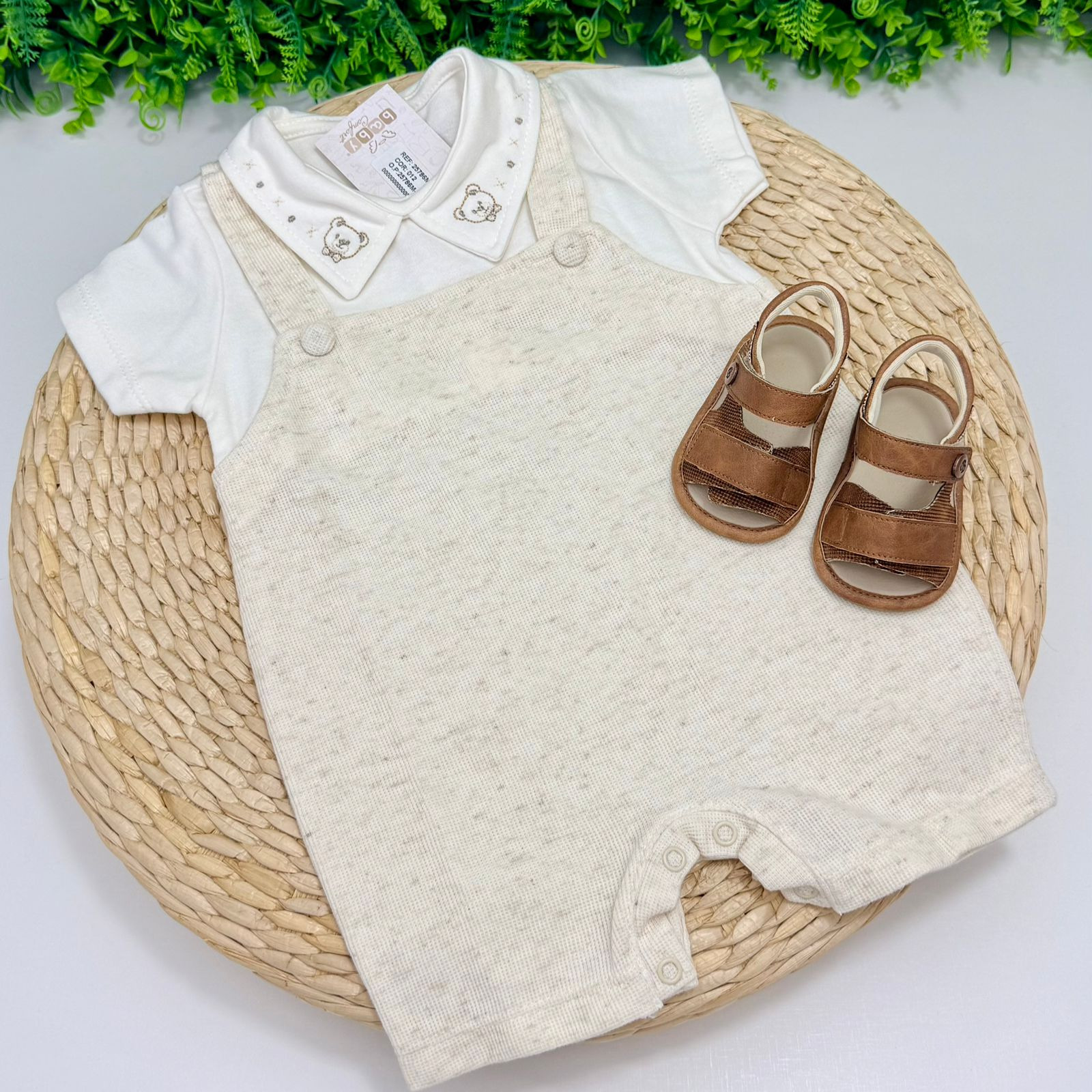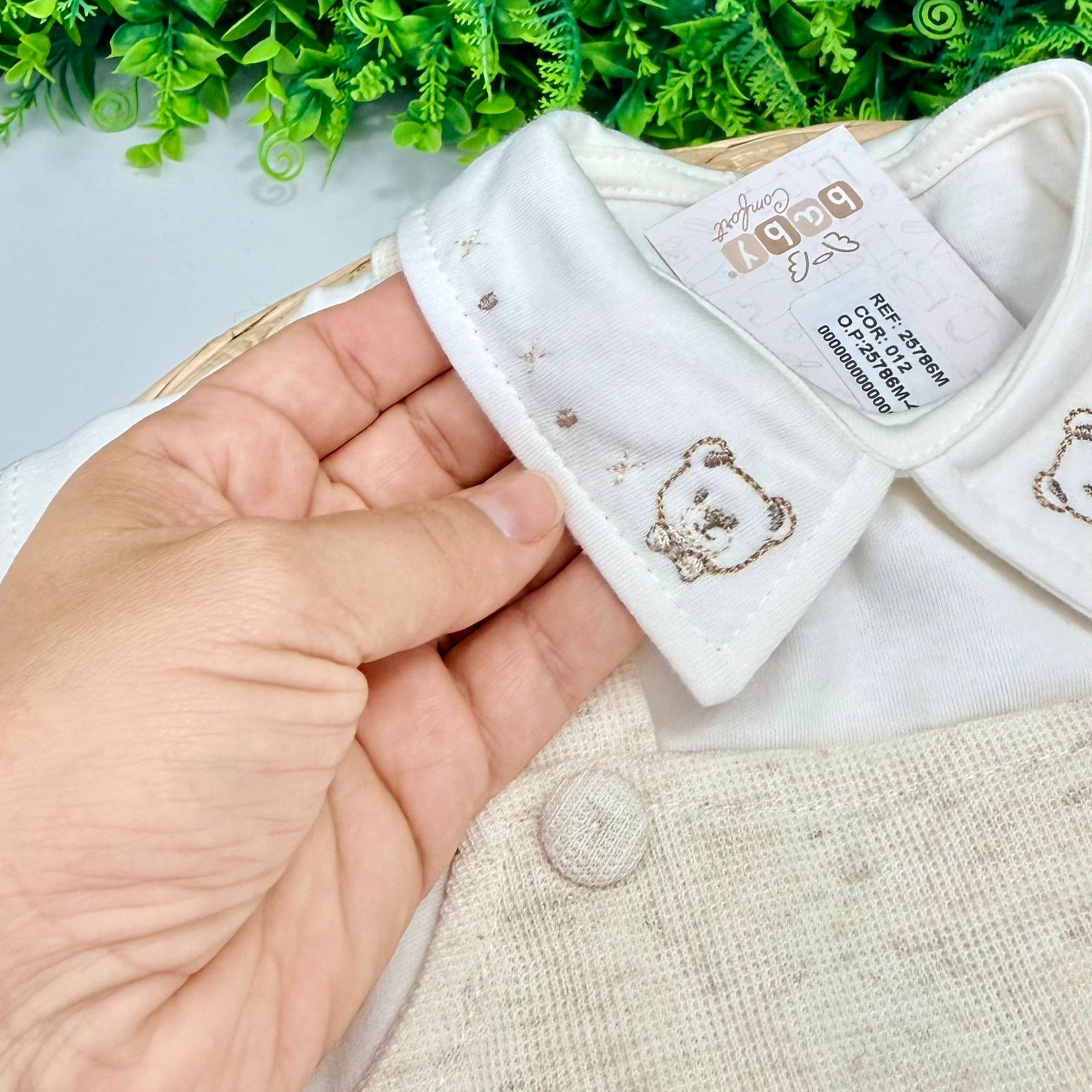 Jardineira infantil masculina da marca Anjos Baby, confeccionada em tecido 100% algodão na cor bege. Acompanha camisa agregada com golinha bordada com ursinhos, trazendo um toque de delicadeza e charme ao visual. Possui botões de pressão na entrepernas e nas costas, que facilitam na hora de vestir e trocar. Uma peça confortável, prática e cheia de estilo para os pequenos.
