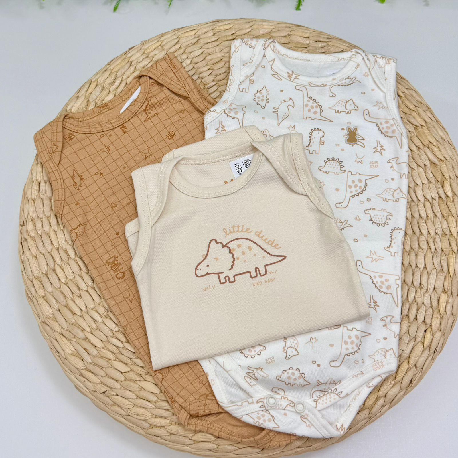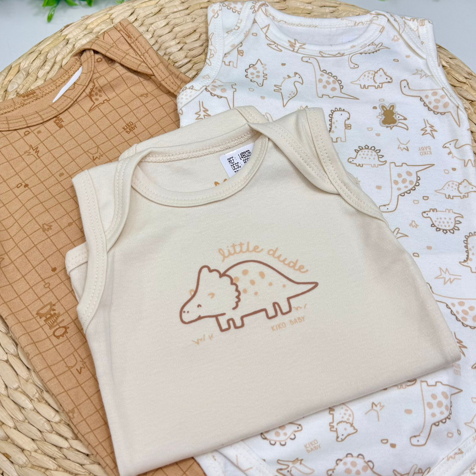 - Esse kit com 3 body regata é perfeito para manter o seu pequeno fresquinho e confortável, sem abrir mão do estilo. Com estampas delicadas de dinossauros e cores neutras e modernas, é uma opção prática e cheia de charme para o dia a dia.