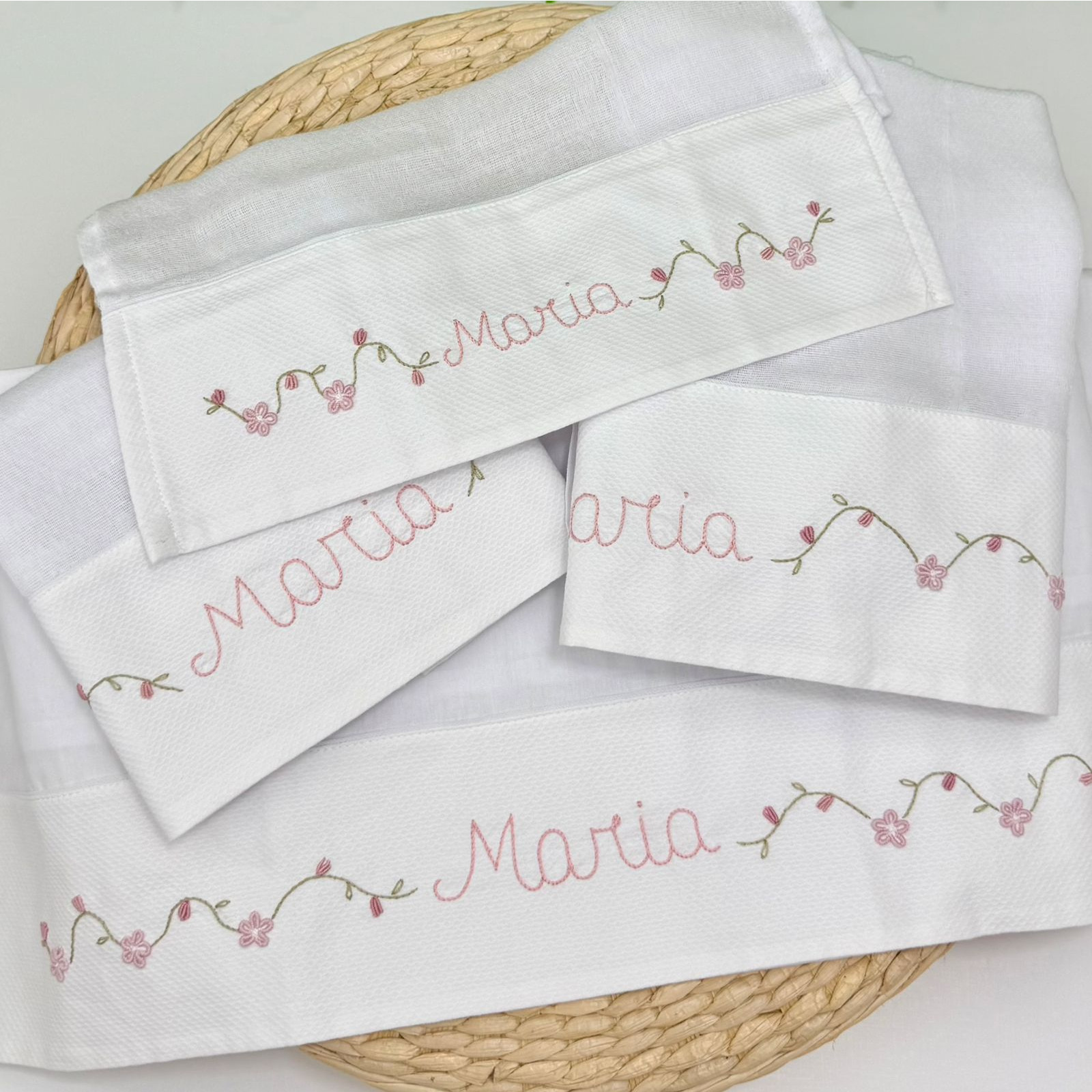 Todas as peças são feitas em fralda Cremer luxo, com barra de piquet e bordado manual personalizado, garantindo delicadeza, durabilidade e um toque artesanal único. O bordado exclusivo adiciona charme e sofisticação, tornando cada kit especial e cheio de significado.