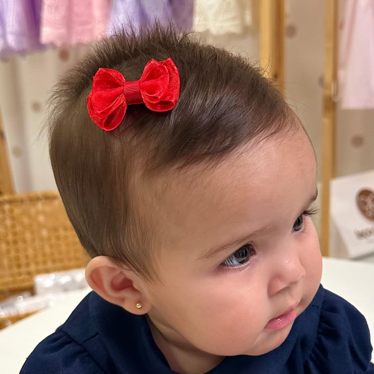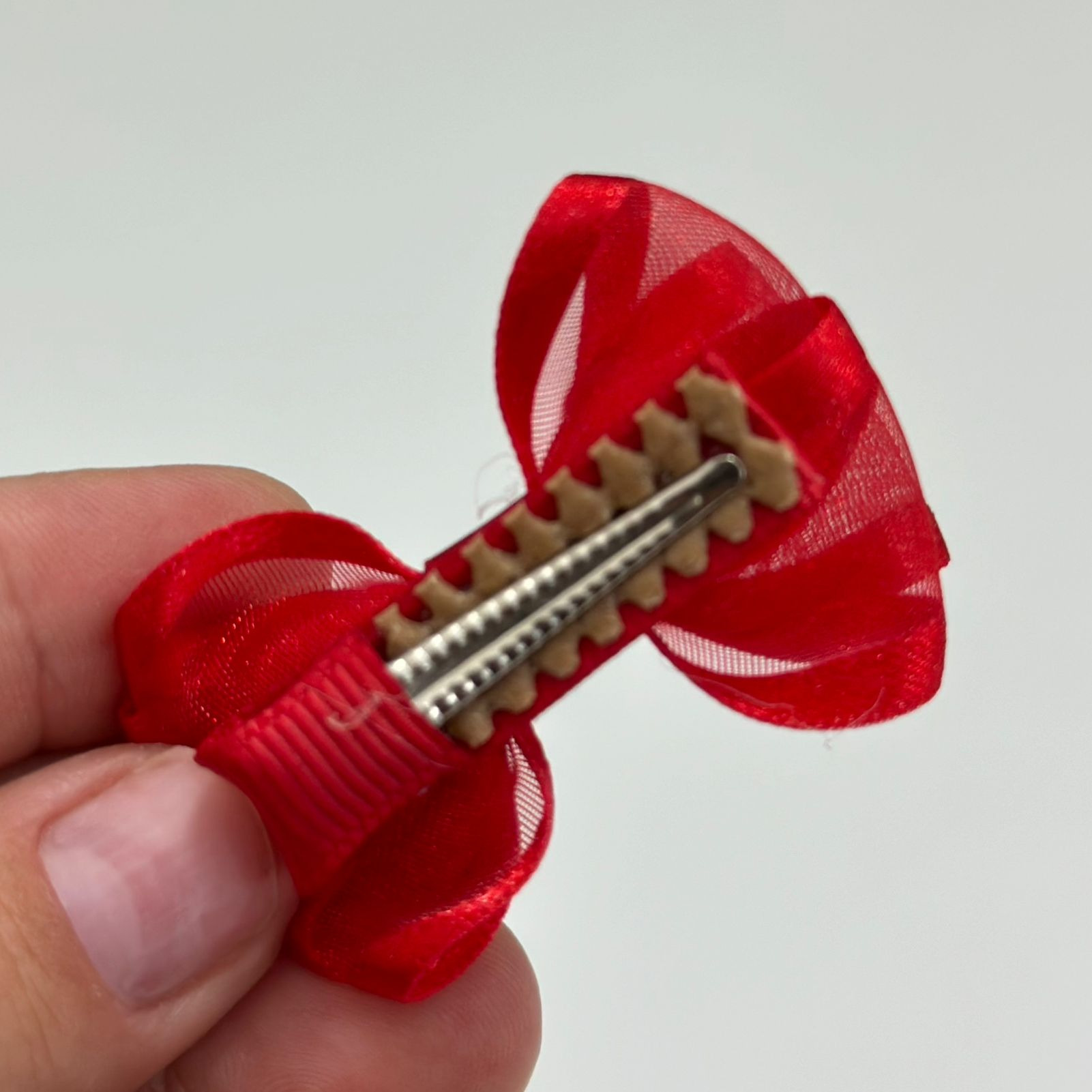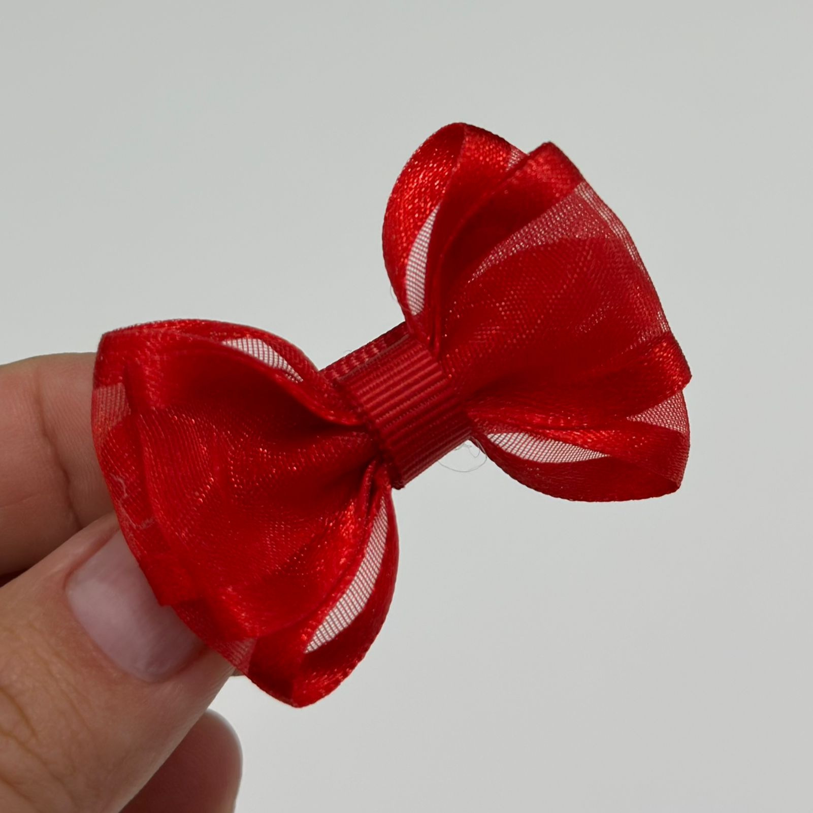 Lacinho confeccionado no tecido de organza na cor vermelha no bico de pato.