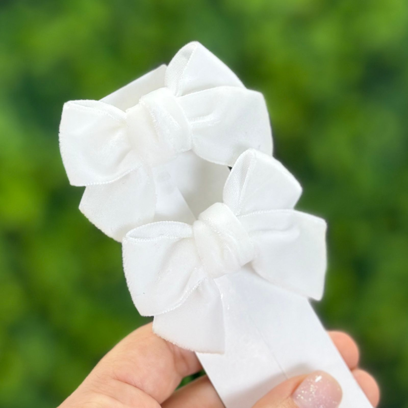 Laço em fita de veludo no bico de pato forrado na cor branca.