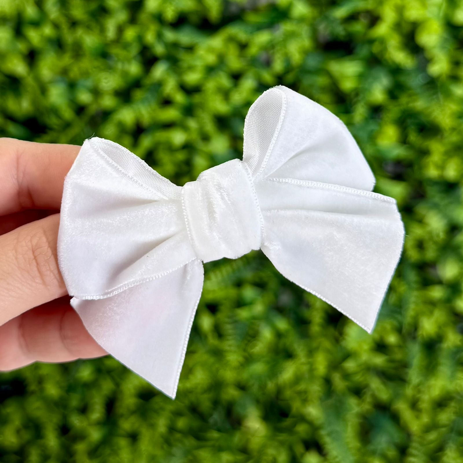 Delicado e sofisticado, este laço em veludo branco é perfeito para ocasiões especiais. Aplicado no bico de pato, garante charme e elegância ao penteado.