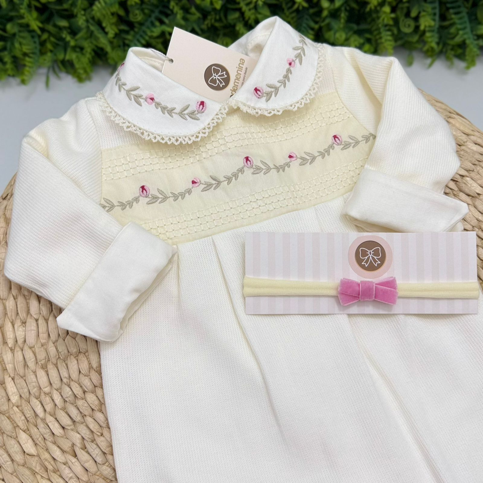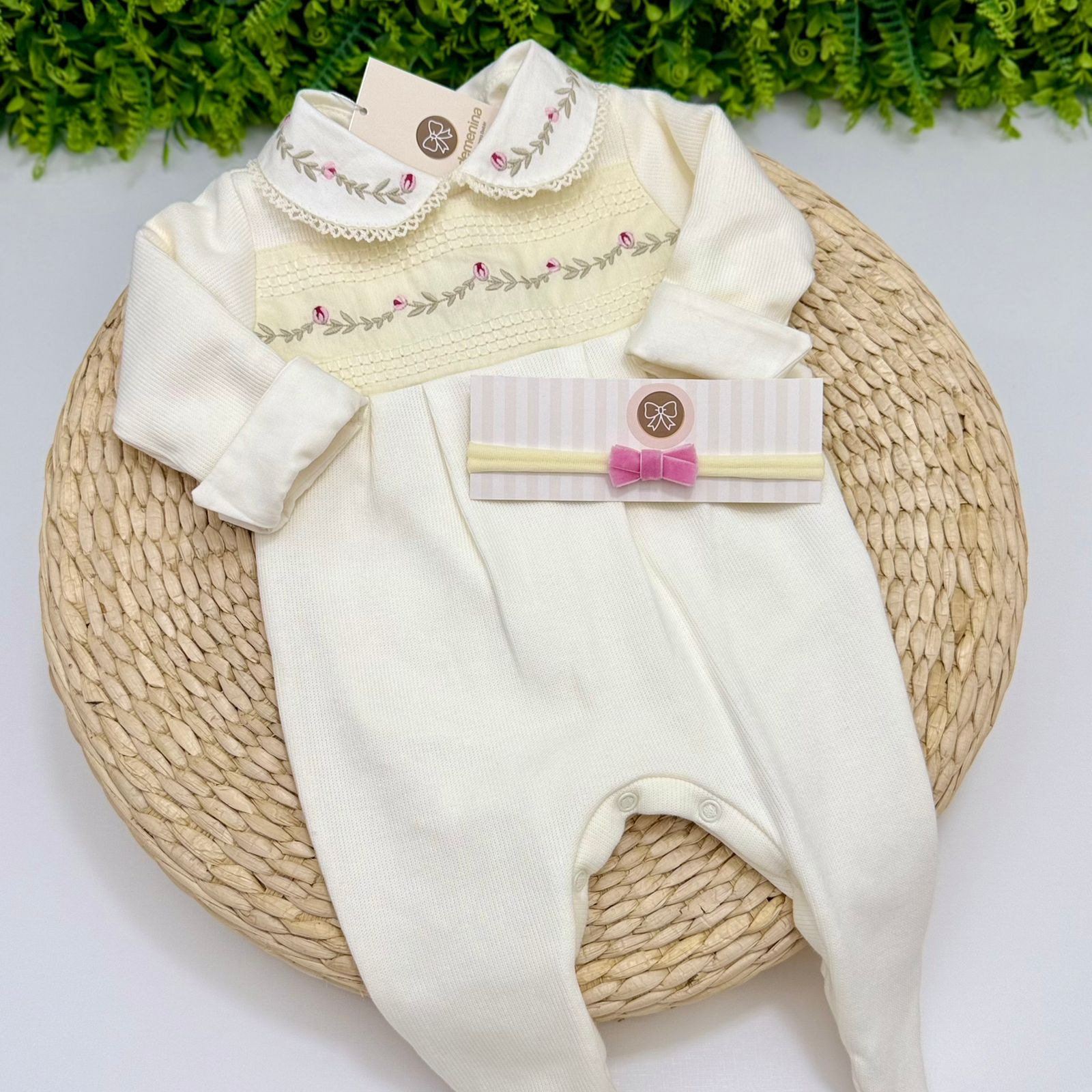 Macacão encantador da marca Kidstar na cor off-white, ideal para compor um look delicado e sofisticado para sua bebê. Confeccionado em tecido macio e confortável, possui detalhe em pala frontal com bordado floral em tons suaves, trazendo um toque clássico e elegante à peça.