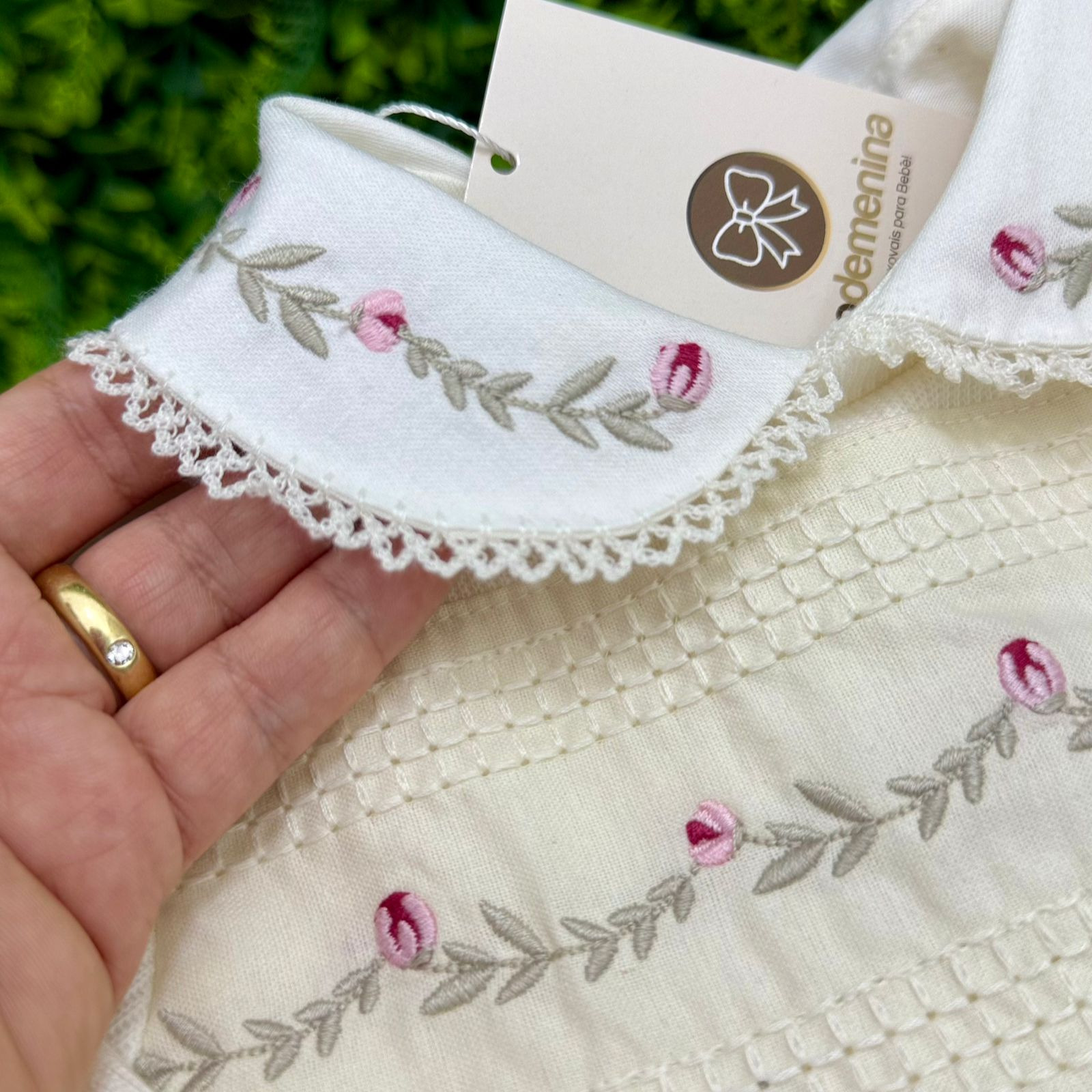 Acompanha body, que é o destaque do conjunto: a gola bordada pertence ao body, trazendo um charme especial e um acabamento delicado quando usado por baixo do macacão.