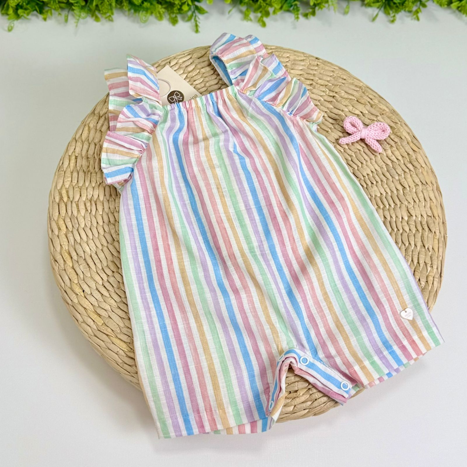 Macacão feminino curto confeccionado em tecido 100% algodão, na estampa listrada. Possui botões imantados no fundo para ajudar na hora da troca da bebê.
