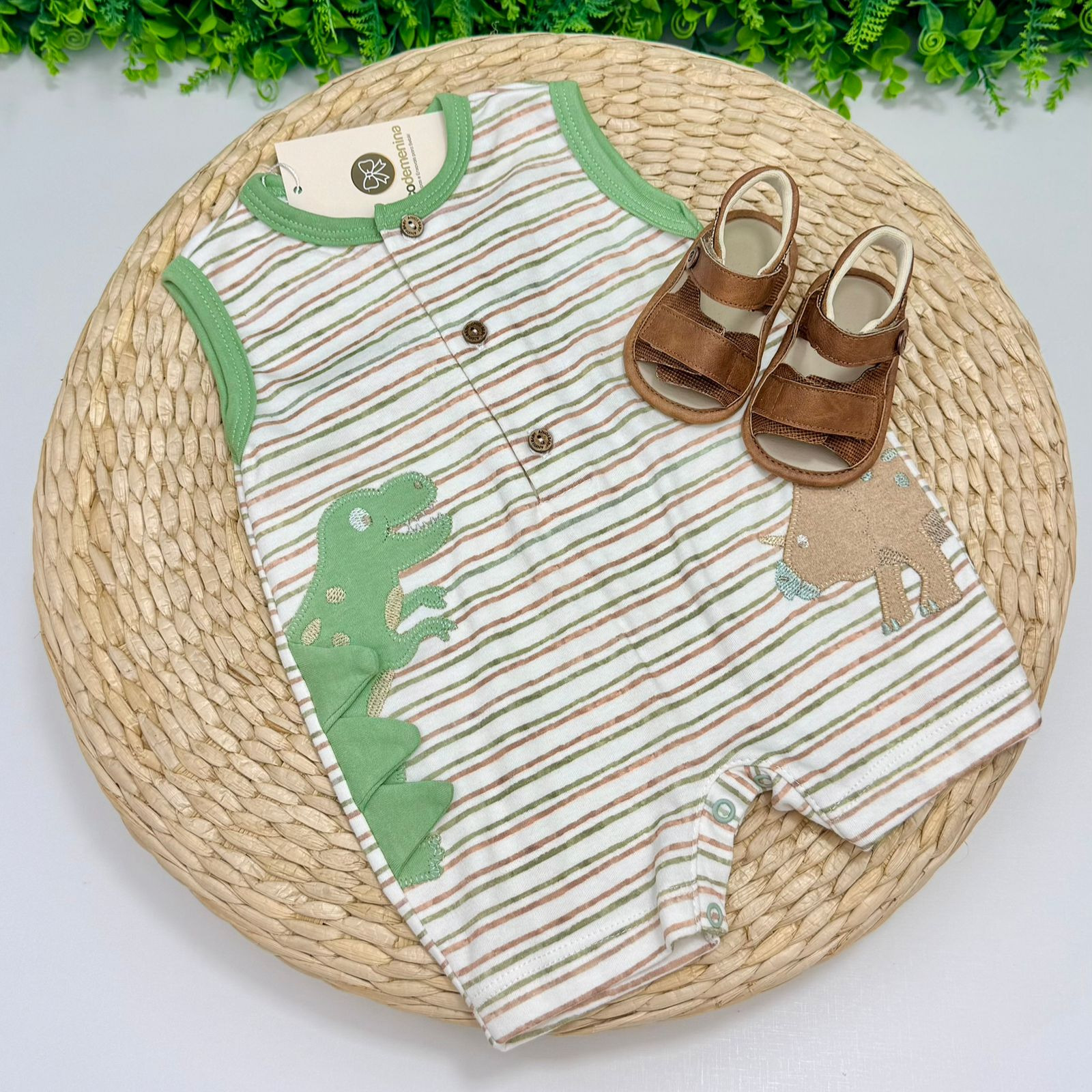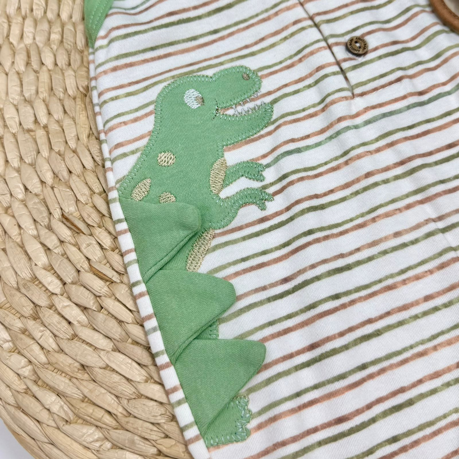 Macacão curto da marca Anjos Baby, confeccionado em tecido 100% algodão, garantindo conforto e respirabilidade para a pele sensível do bebê. O modelo apresenta estampa listrada super delicada e bordados de dinossauros nas laterais, trazendo um charme extra ao visual.