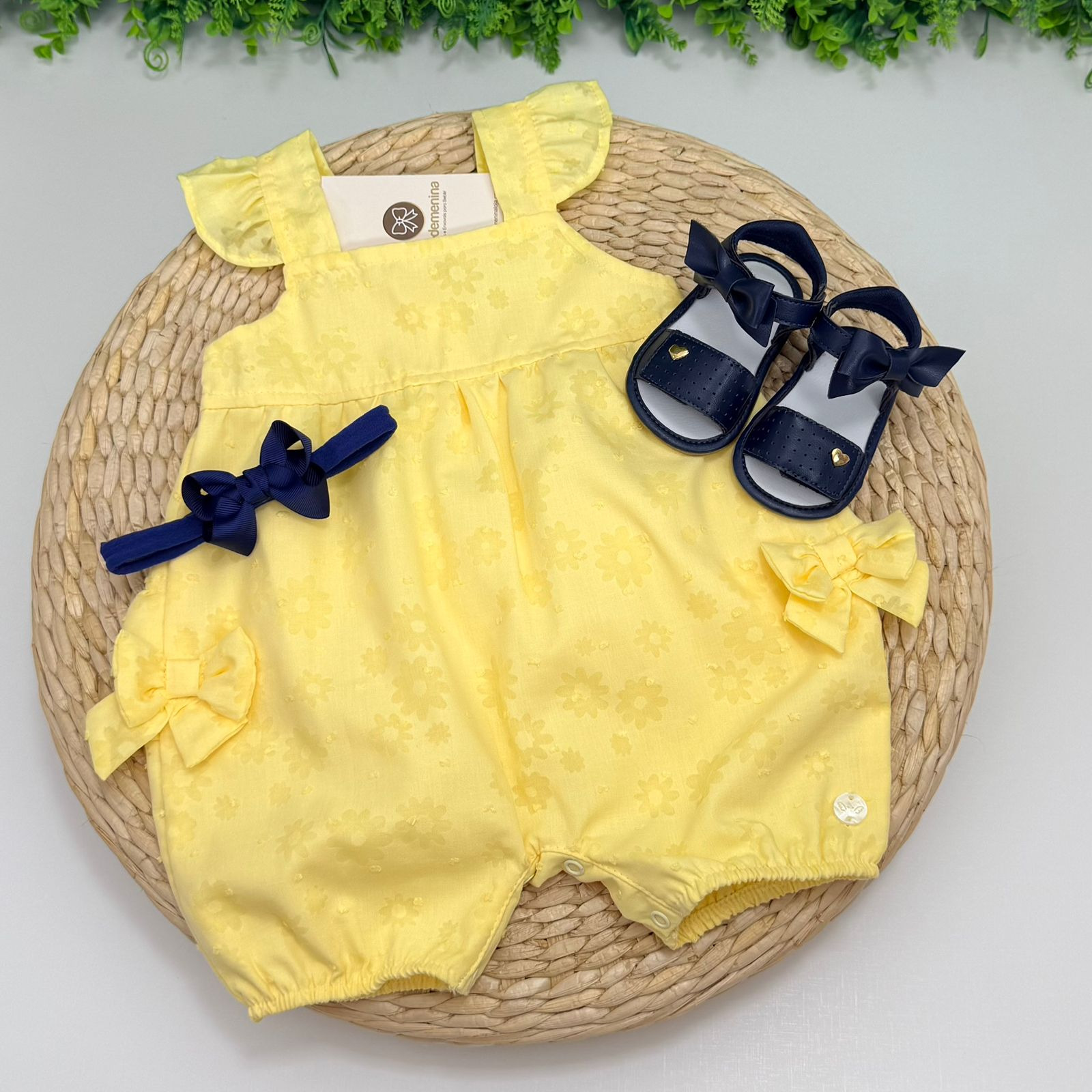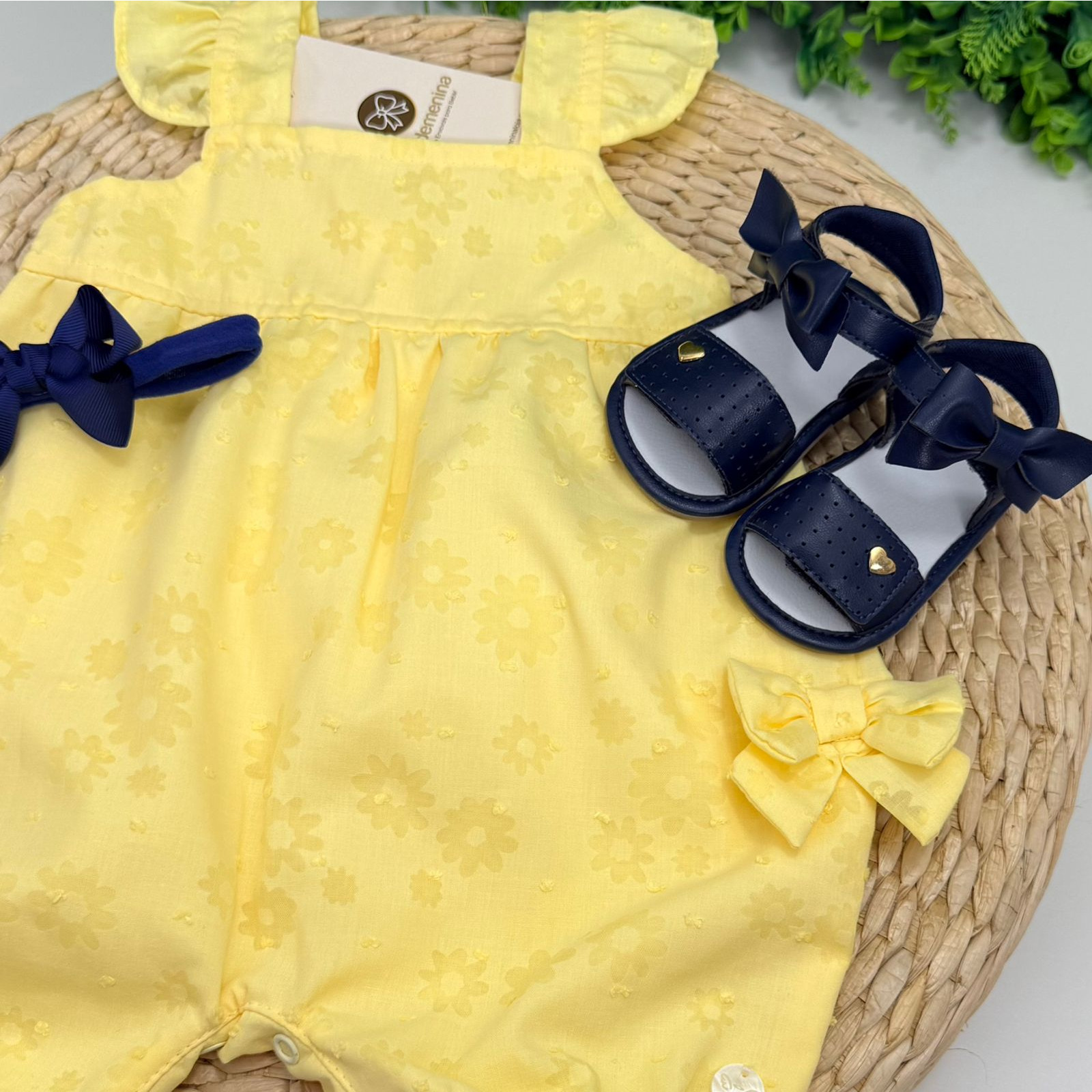 Macacão curto feminino da marca Anjos Baby, na cor amarela. Confeccionado em tecido de algodão com poliéster, oferecendo conforto, maciez e durabilidade. Apresenta delicados bordados de flores por todo o comprimento e aplicações de laços nas laterais, garantindo um visual encantador. Possui botões de pressão na entreperna e nas costas, proporcionando praticidade na hora de vestir e trocar. Uma peça perfeita para deixar a bebê confortável e estilosa.