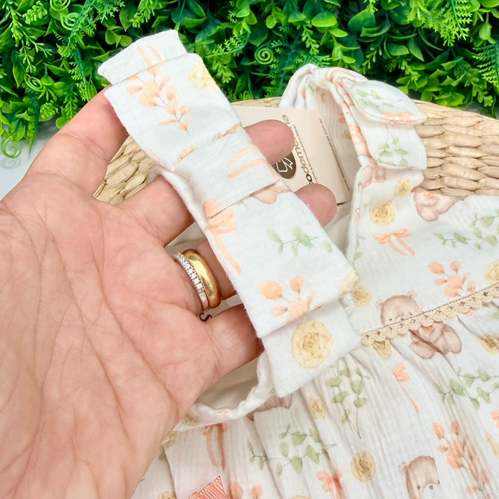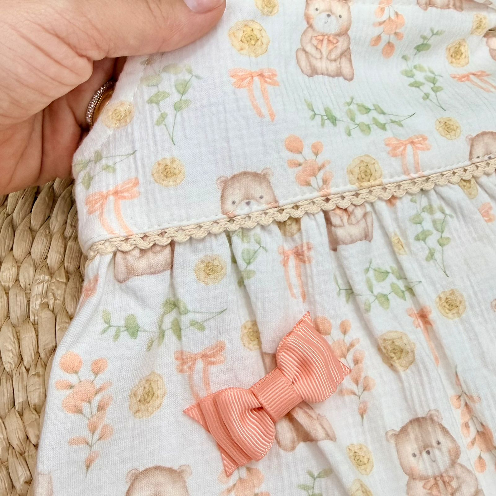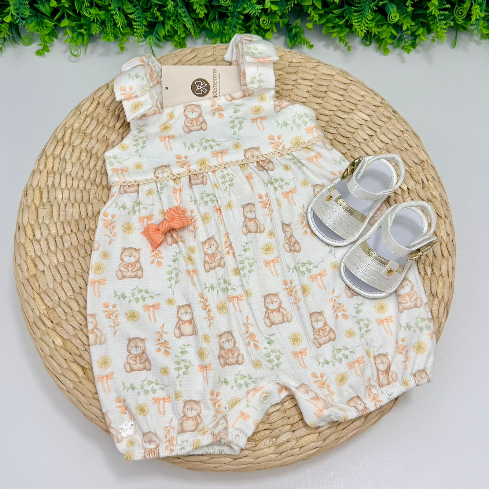 Macaquinho feminino bebê com estampa de ursinhos e florais, laço decorativo e acabamento delicado. Confortável, leve e prático, com fechamento inferior por botões de pressão, perfeito para unir charme e funcionalidade.