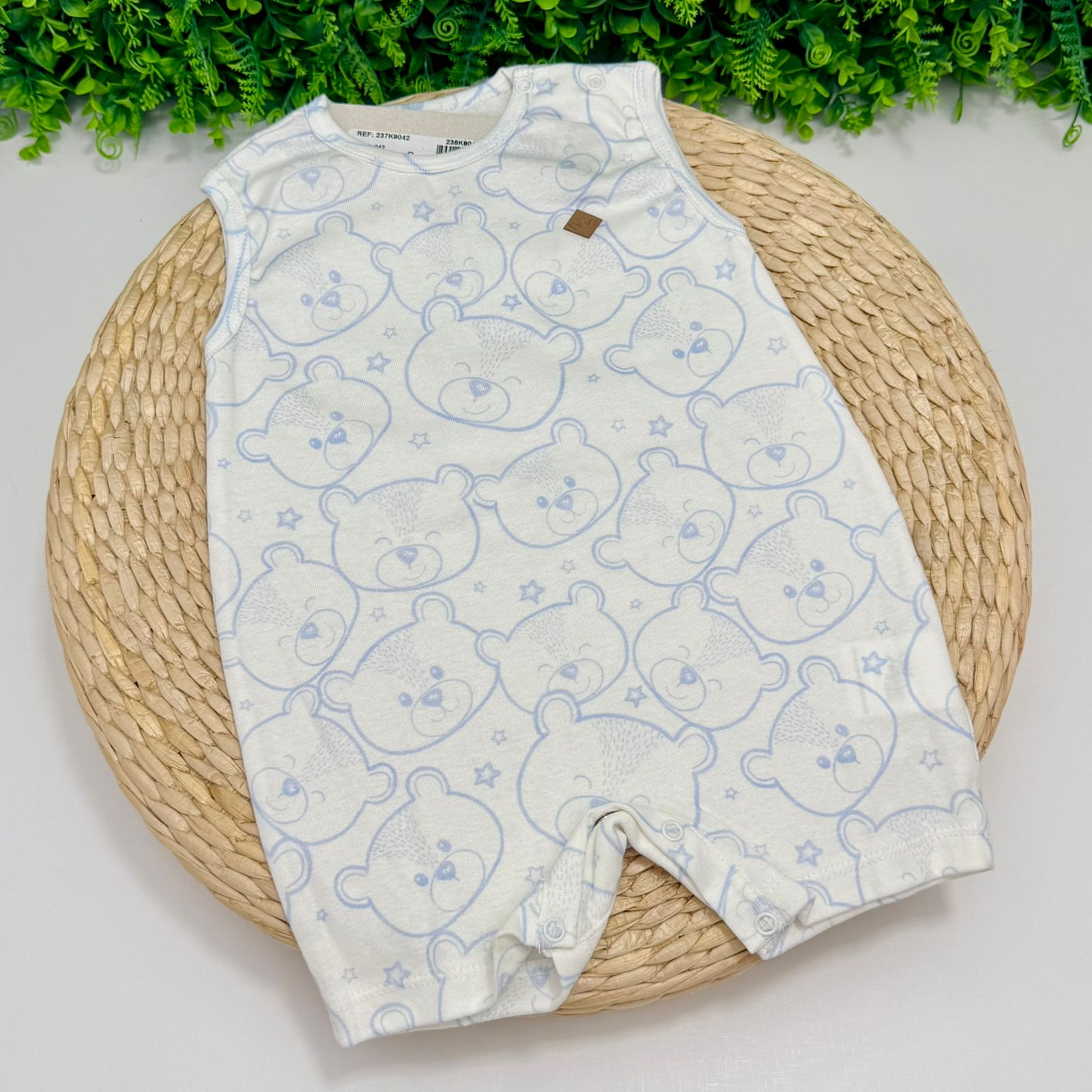 Macacão confeccionado em malha 100% algodão na cor branca e estampa de ursinhos. Possui botões no fundo e nos ombros para facilitar na hora da troca do bebê.