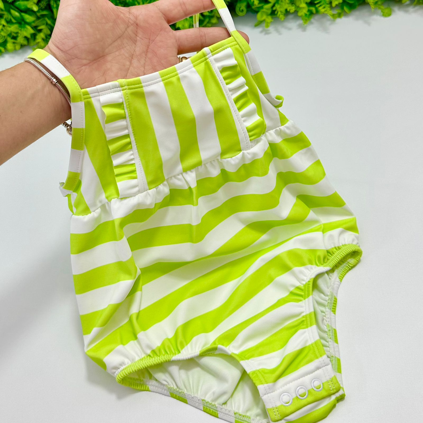 Maiô Infantil em Lycra com Proteção UV, estampa listrada em verde limão. Confortável e prático, com botões imantados no fundo para facilitar a troca da bebê. Perfeito para dias de sol com muita proteção e estilo!