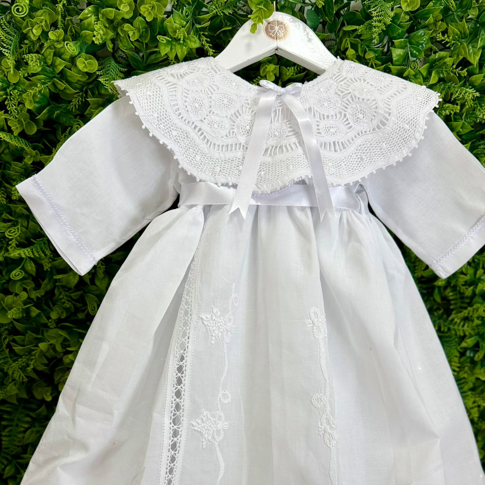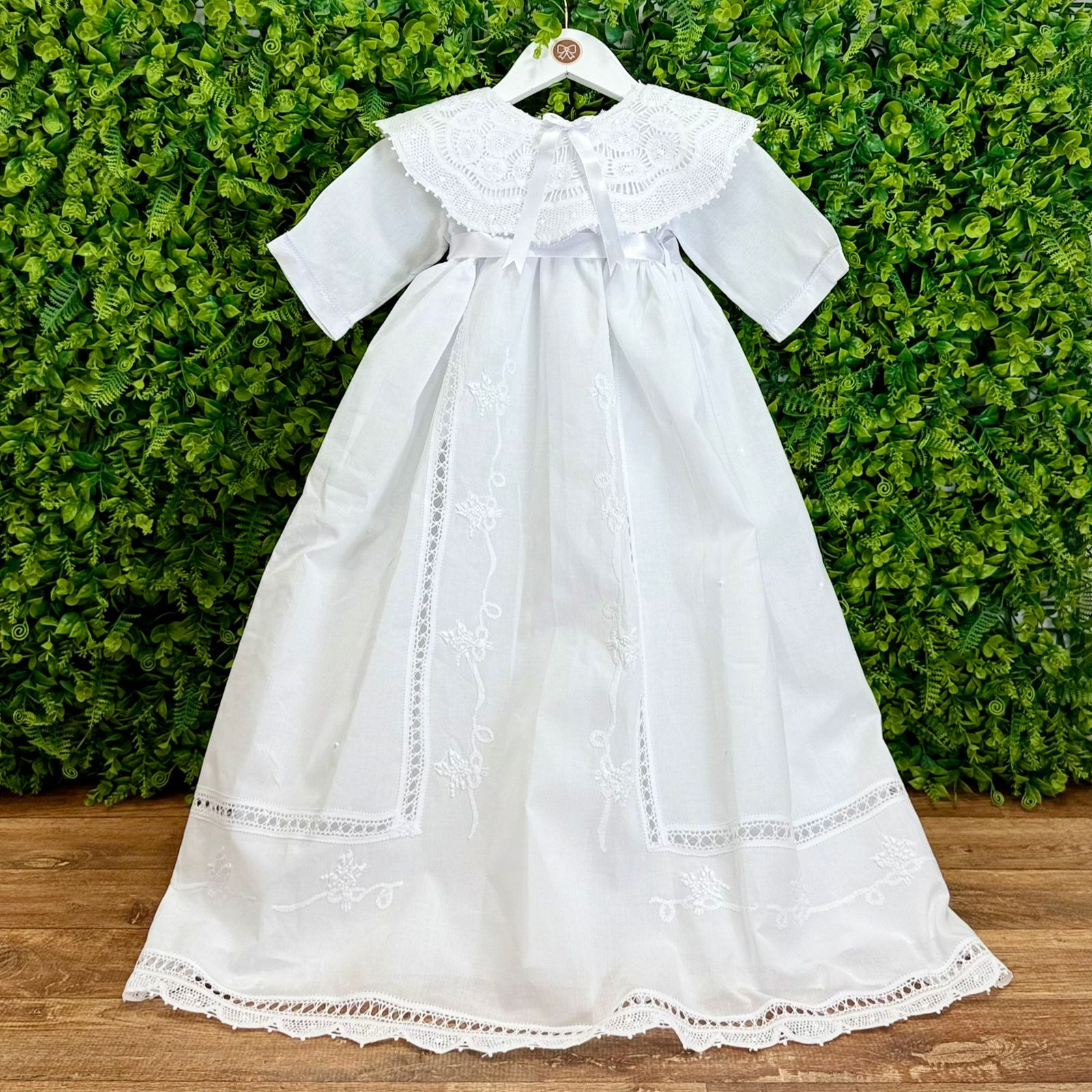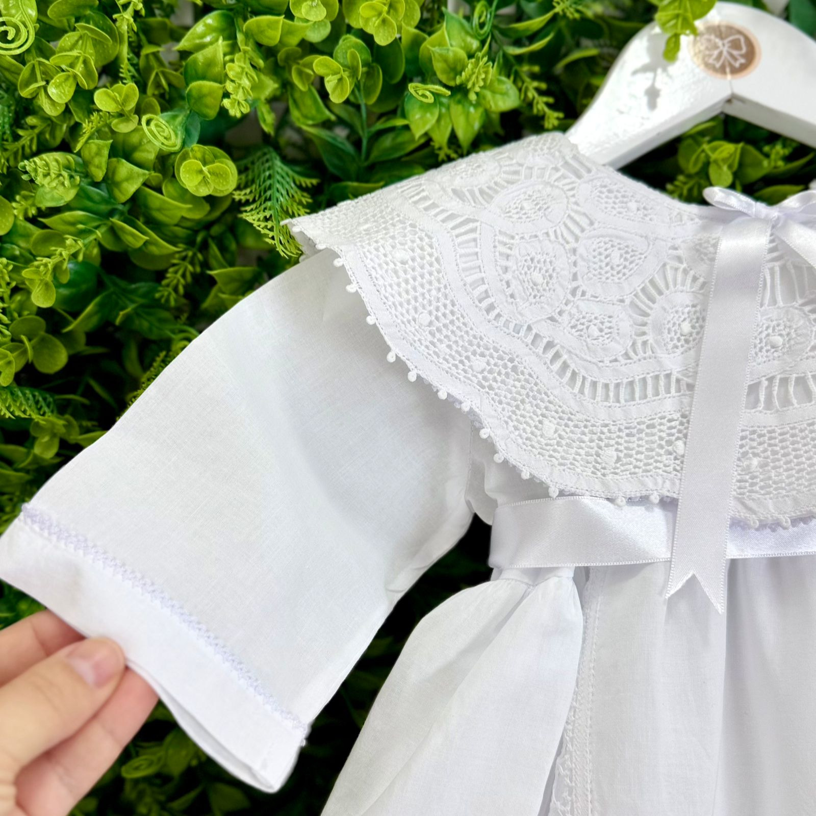 Com detalhes delicados em bordado branco floral e rendas em algodão, a peça possui um acabamento impecável que une tradição e elegância. O babado do colarinho em renda renascença bordada com laço central dá um toque romântico e atemporal.
