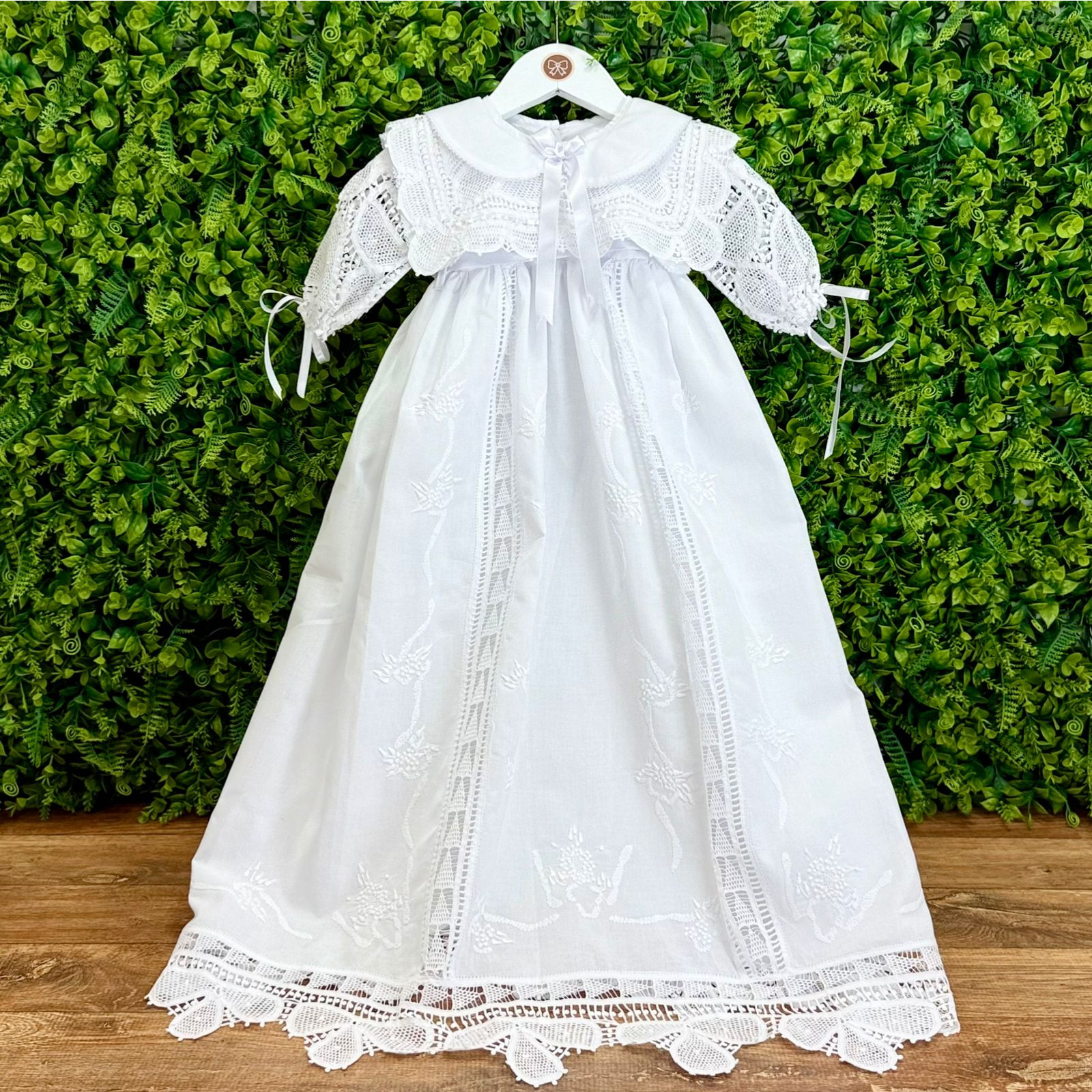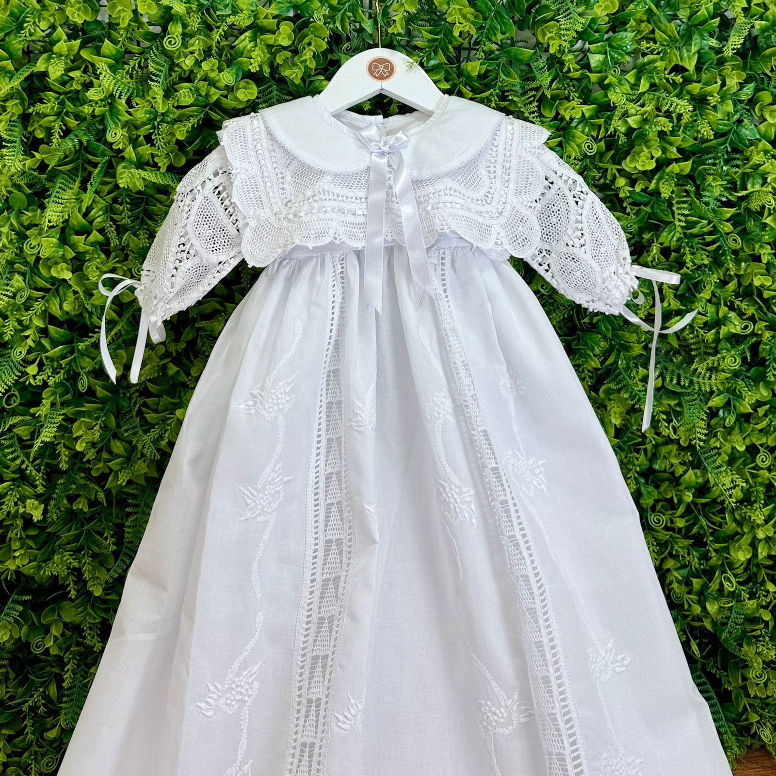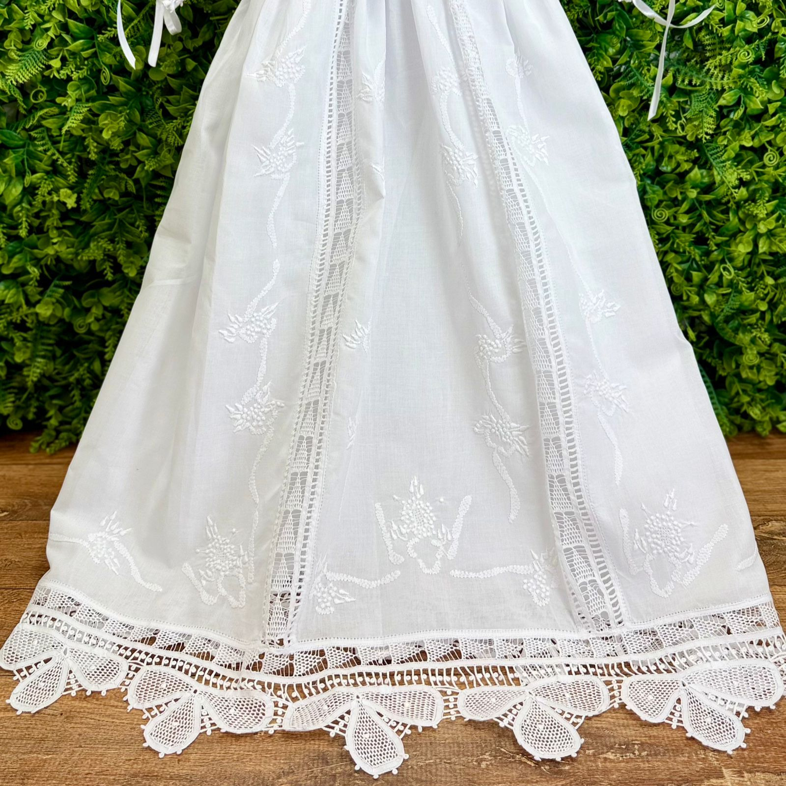 Celebre um momento único com o nosso Mandrião de Batizado Clássico Branco, uma peça que combina tradição, delicadeza e sofisticação. Confeccionado em tecido 100% algodão, o mandrião possui bordados manuais finos e ricos em detalhes, com rendas delicadas que percorrem o comprimento da peça e finalizam com um barrado rendado de acabamento impecável de renda margarida.
