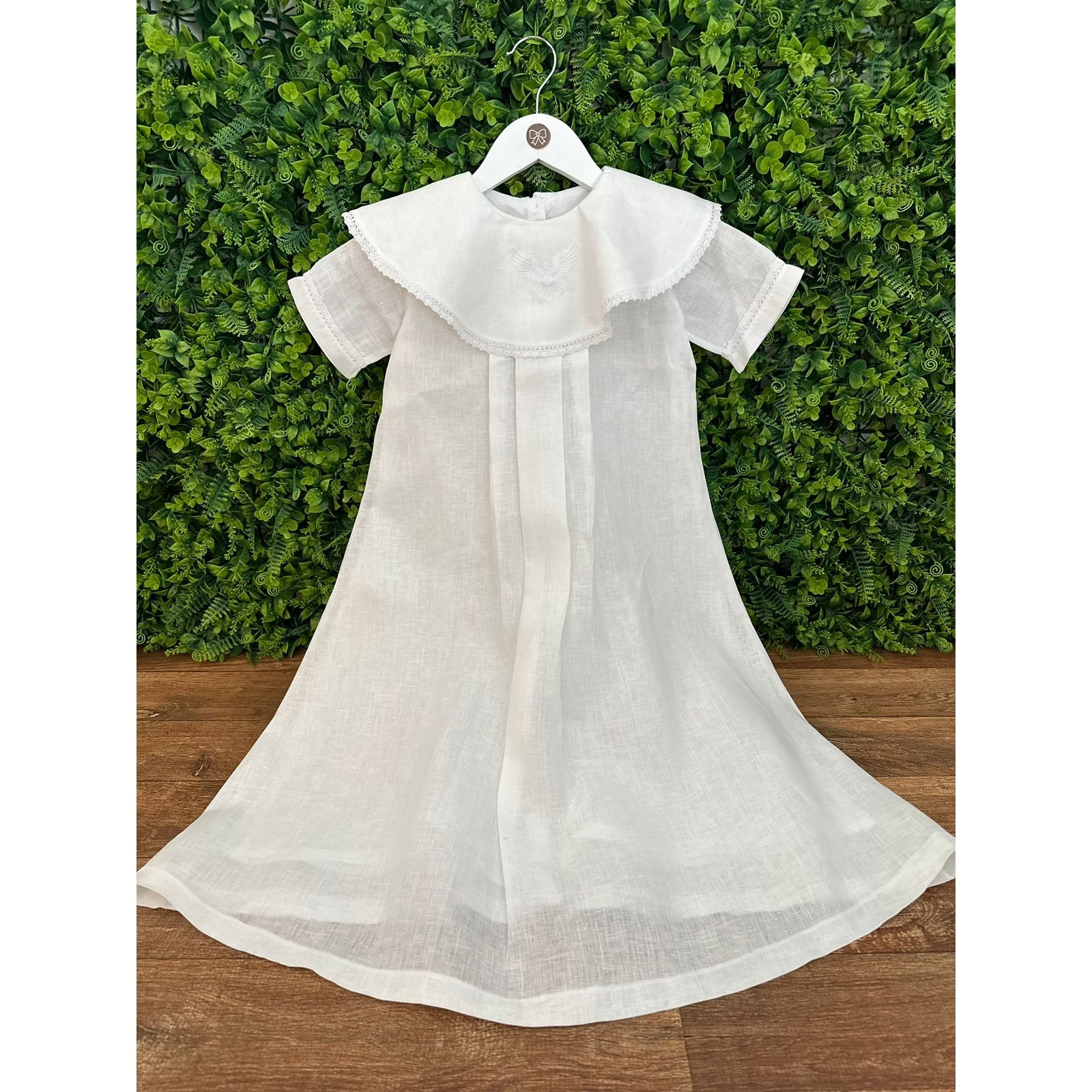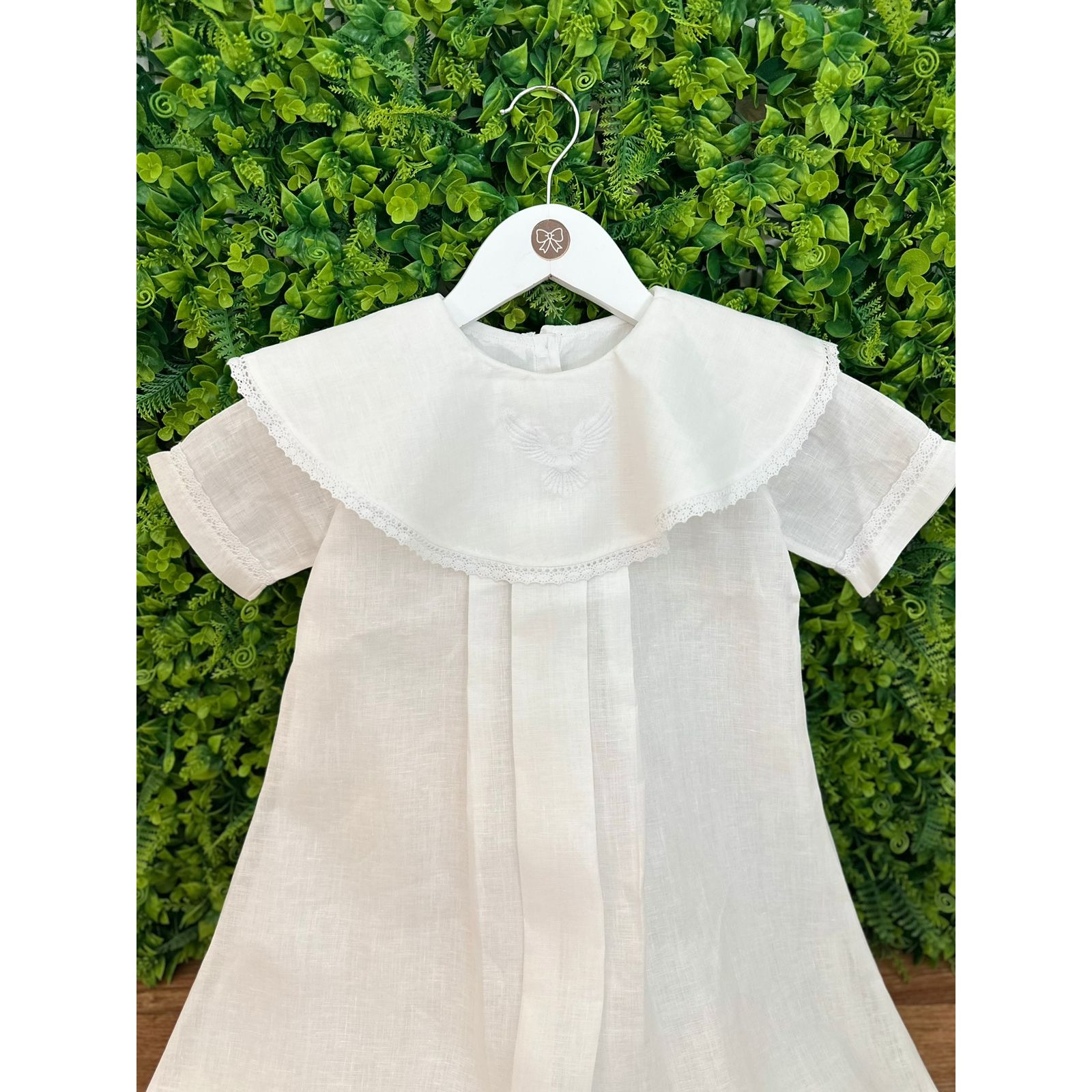 O destaque fica por conta do bordado do Espírito Santo símbolo de luz e pureza feito com riqueza de detalhes, conferindo um toque espiritual e refinado à peça. A modelagem clássica garante um caimento leve e confortável, respeitando a sensibilidade do bebê e valorizando a solenidade da ocasião.