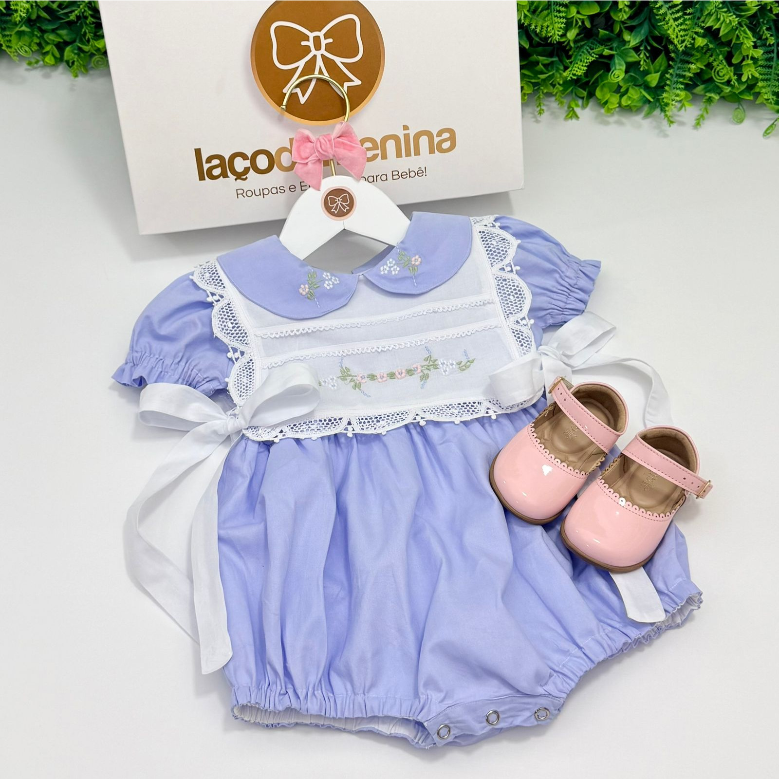 O Pimpão Azul com Bordado Floral e Babador Removível da Laço de Menina é uma peça charmosa e versátil para vestir seu bebê com conforto e elegância.