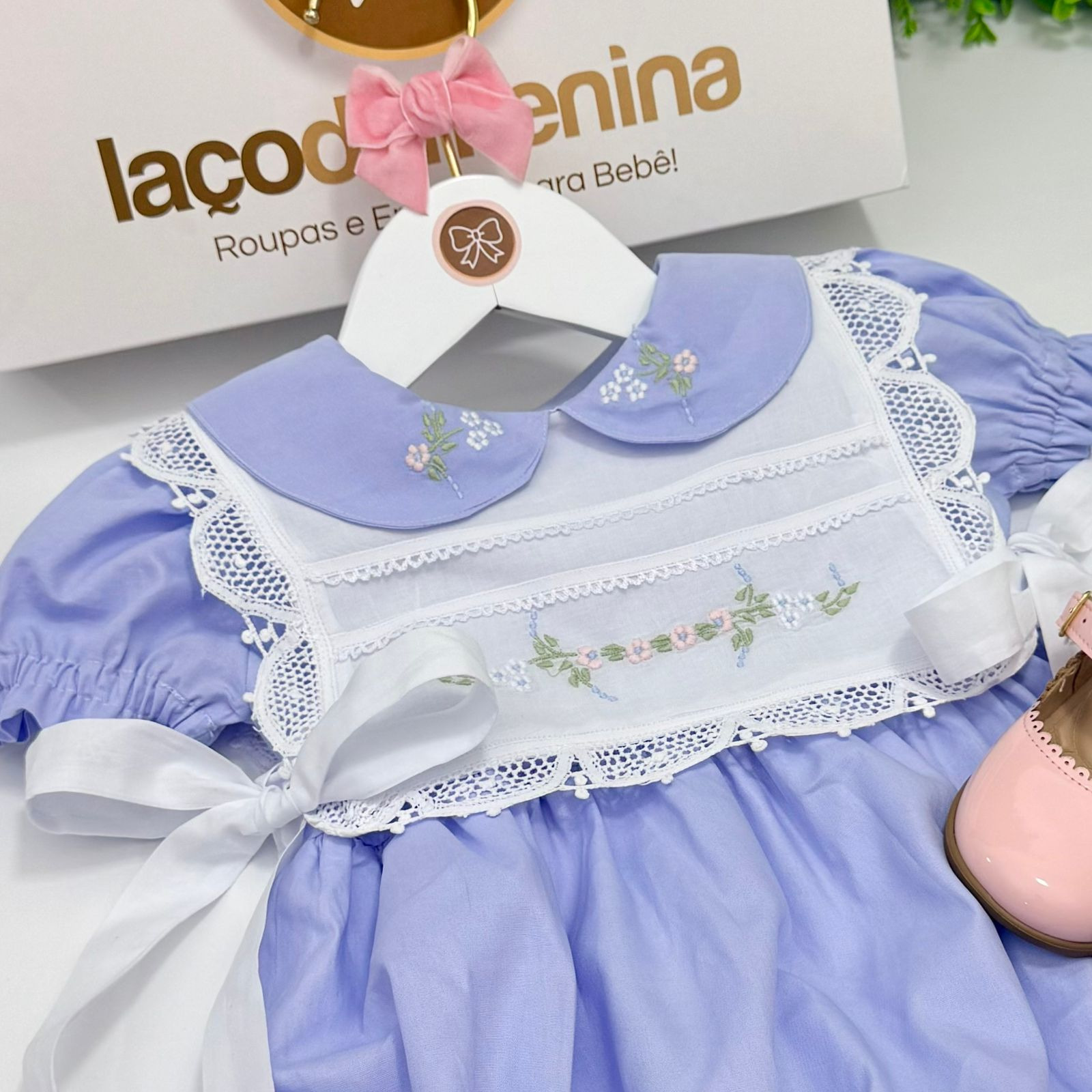 Acompanha um babador removível em tecido branco, com bordados florais combinando e acabamento em Renda Renascença, que adiciona um toque clássico e sofisticado à produção. Ideal para aniversários, visitas especiais, ensaios fotográficos e passeios, este pimpão une delicadeza e praticidade.
