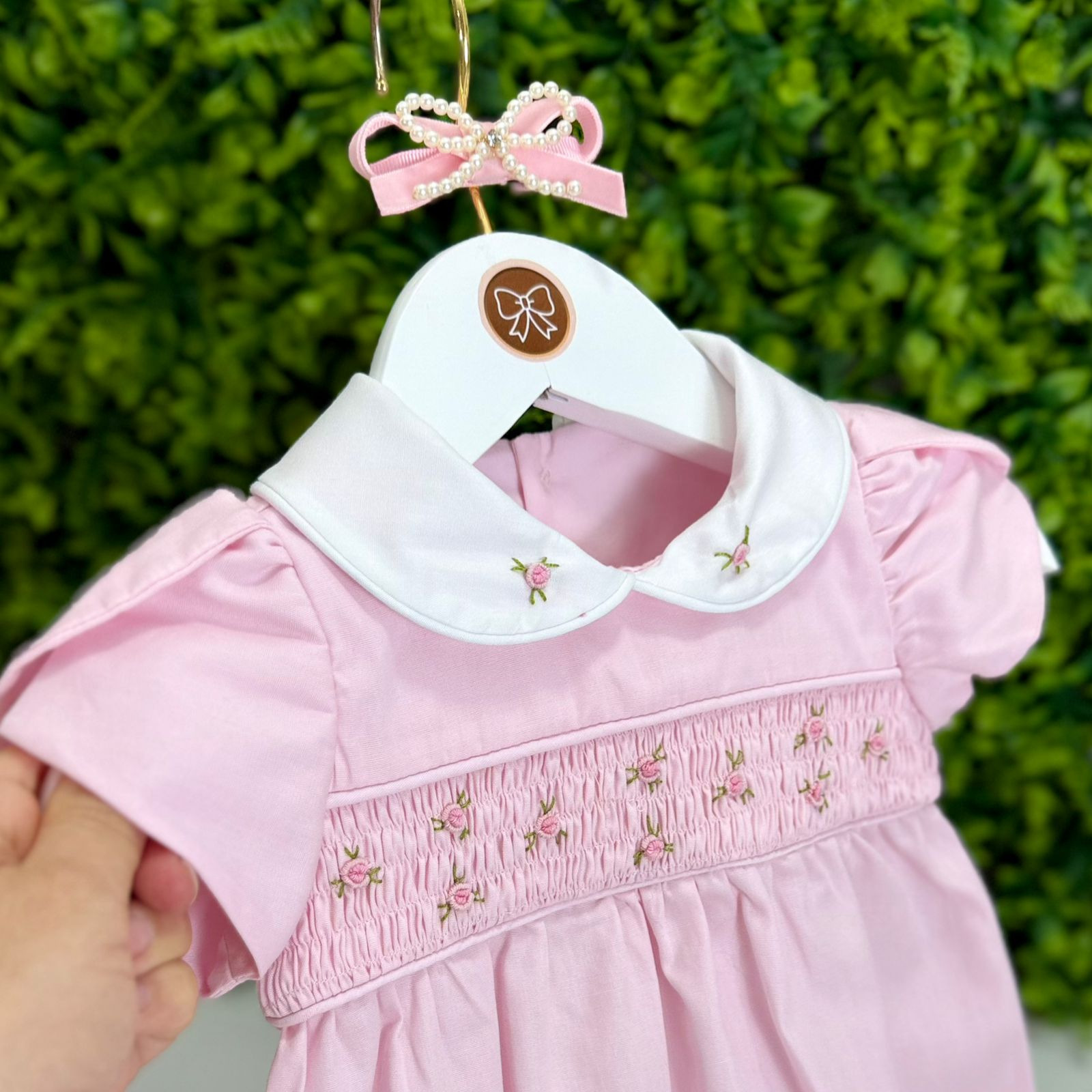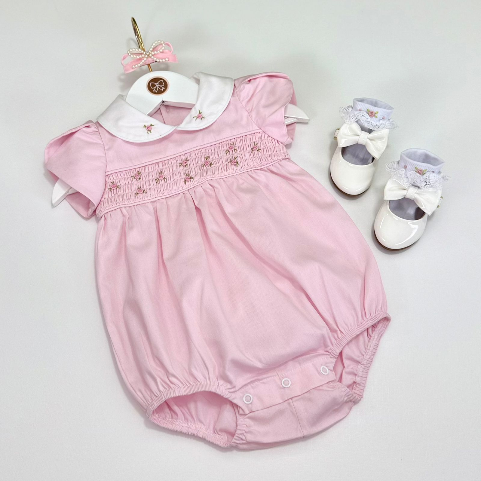 Pimpão delicado em tom rosa, com golinha branca e bordado floral na pala smock. Possui manguinhas curtas e botões de pressão para facilitar a troca. Perfeito para ocasiões especiais com muito charme!