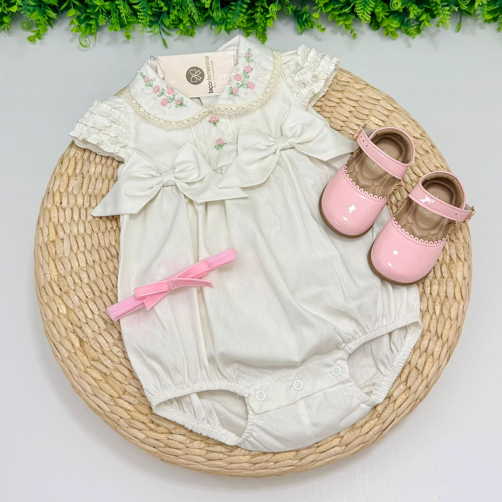 Delicado e elegante, o pimpão infantil na cor off-white é perfeito para ocasiões especiais. Confeccionado em tecido leve e confortável, possui modelagem charmosa com mangas curtas e acabamento refinado. O destaque fica por conta do laço frontal e do bordado floral delicado na gola, que trazem um toque romântico e sofisticado à peça. Conta ainda com fechamento prático entre as pernas, facilitando a troca e garantindo mais conforto para o bebê.