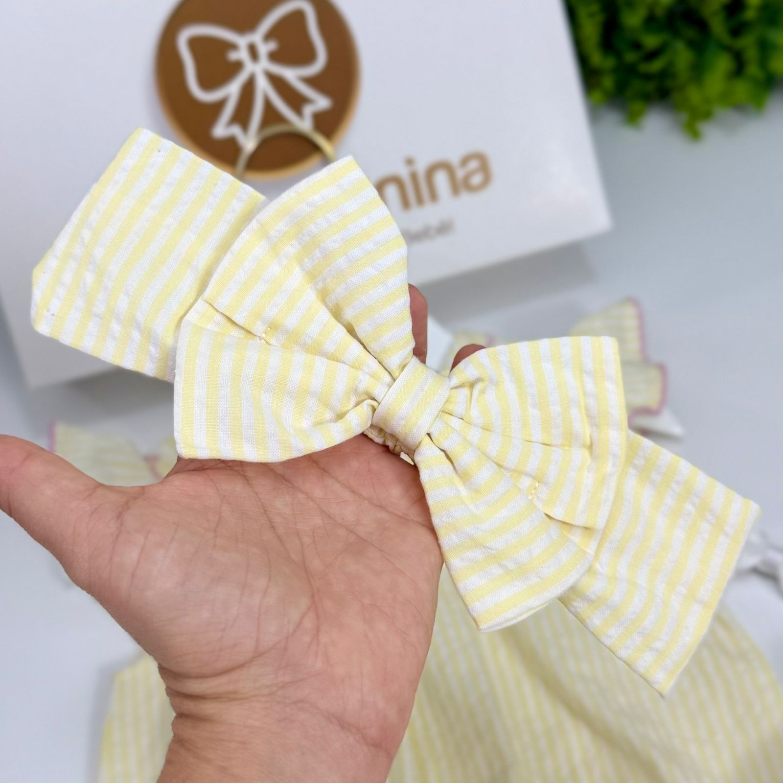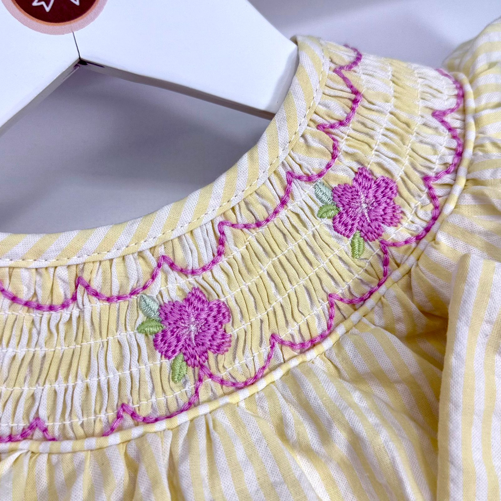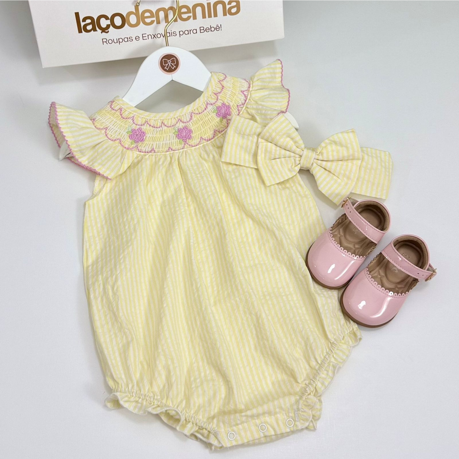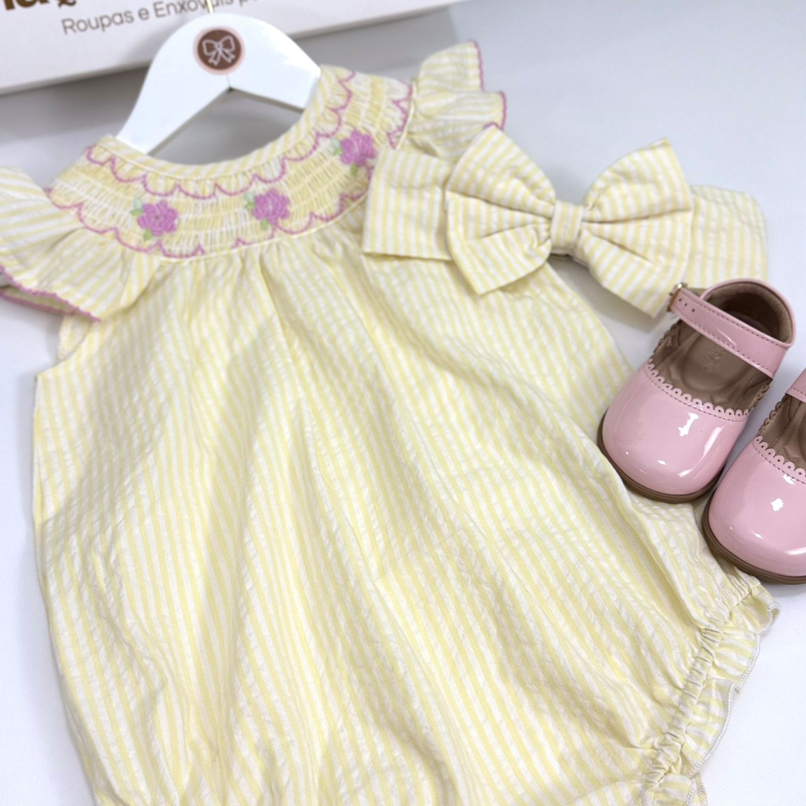 Pimpão delicado em tom amarelo suave com listras, confeccionado em tecido leve e confortável. Possui bordado smock no busto com flores delicadas, trazendo um toque clássico e encantador. As mangas com babadinhos completam o visual com muita doçura e elegância.