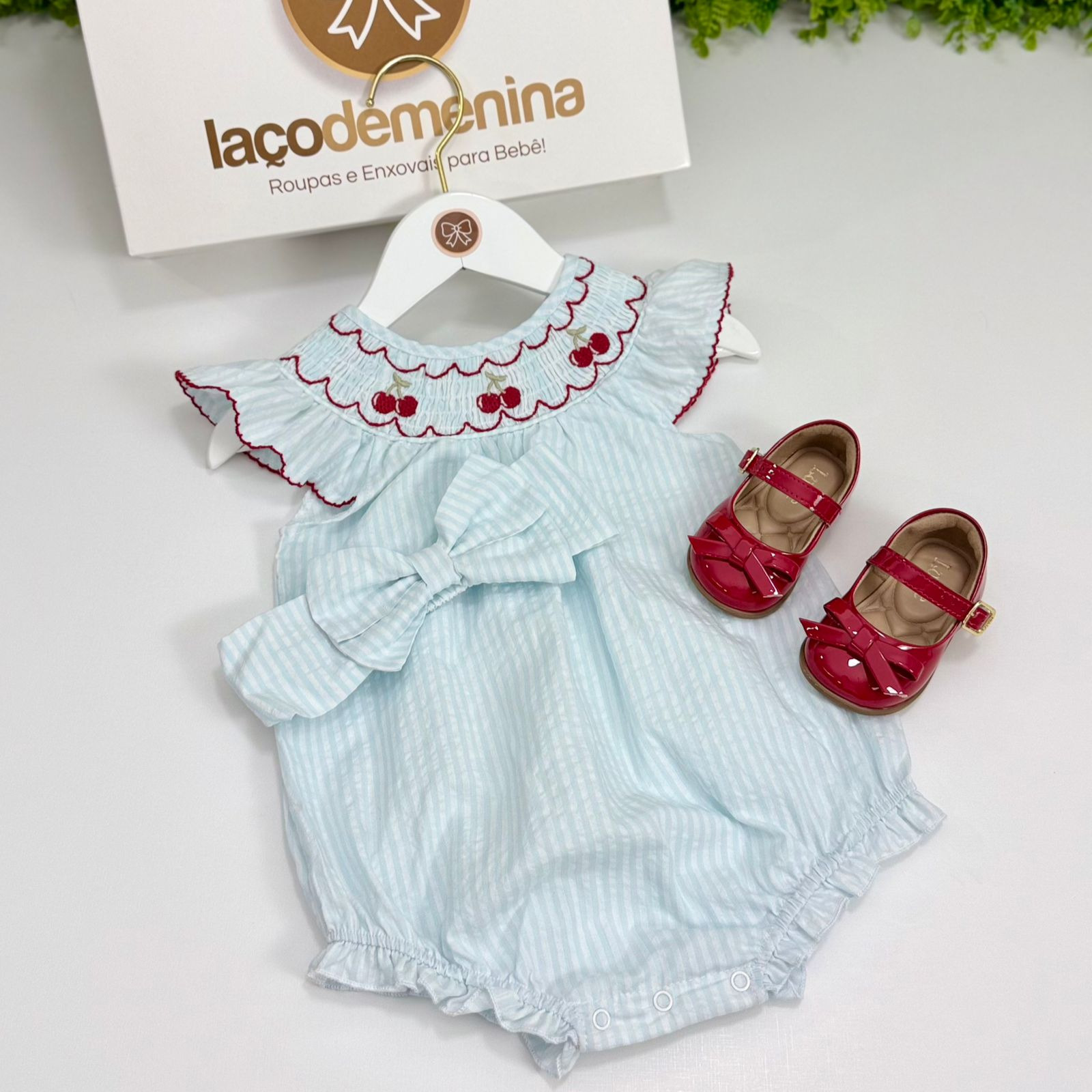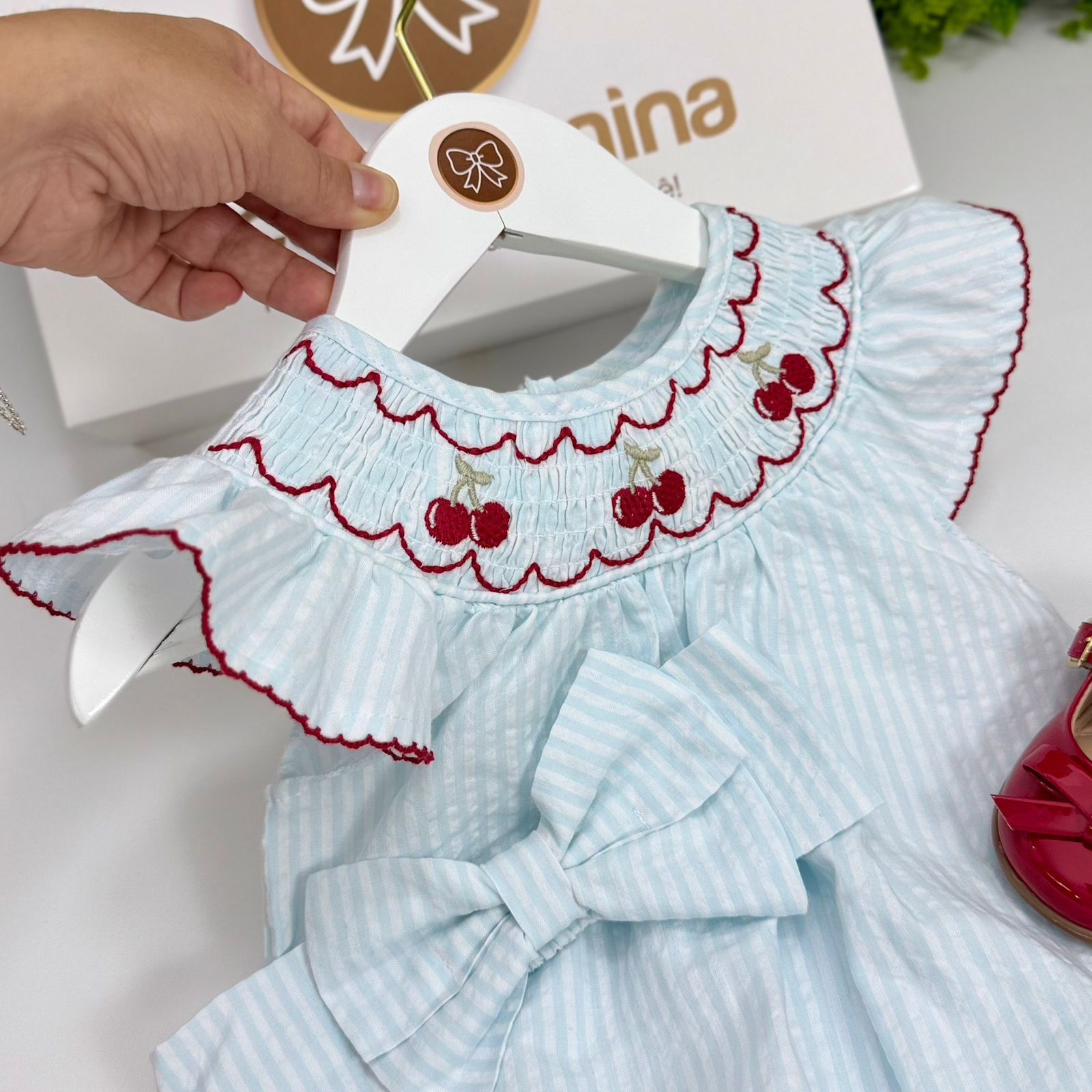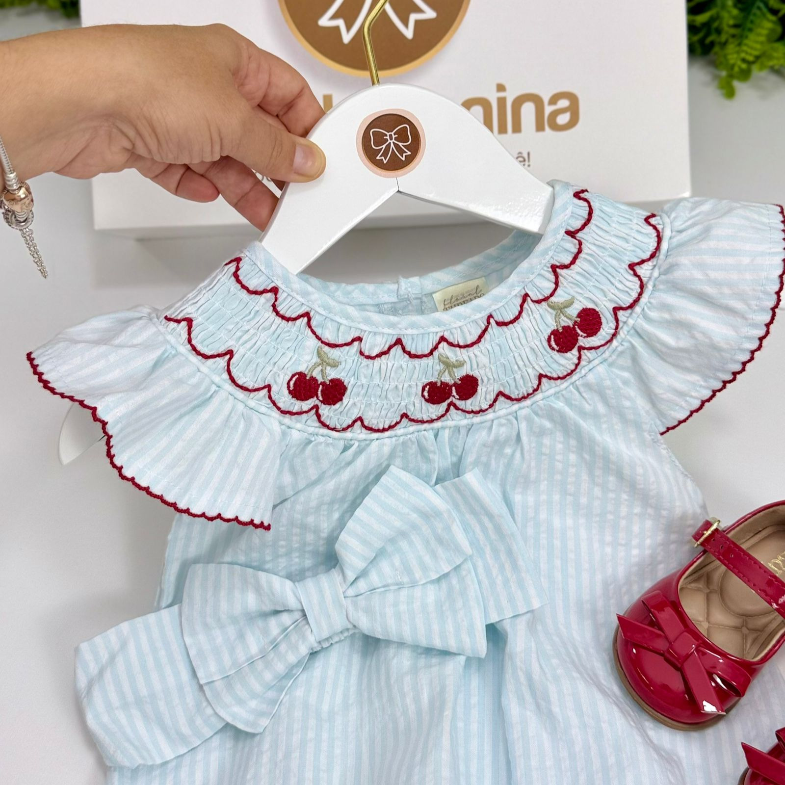 Pimpão delicado em tom azul suave com listras, confeccionado em tecido leve e confortável. Possui bordado smock no busto com cerejinhas delicadas, trazendo um toque clássico e encantador. As mangas com babadinhos completam o visual com muita doçura e elegância.