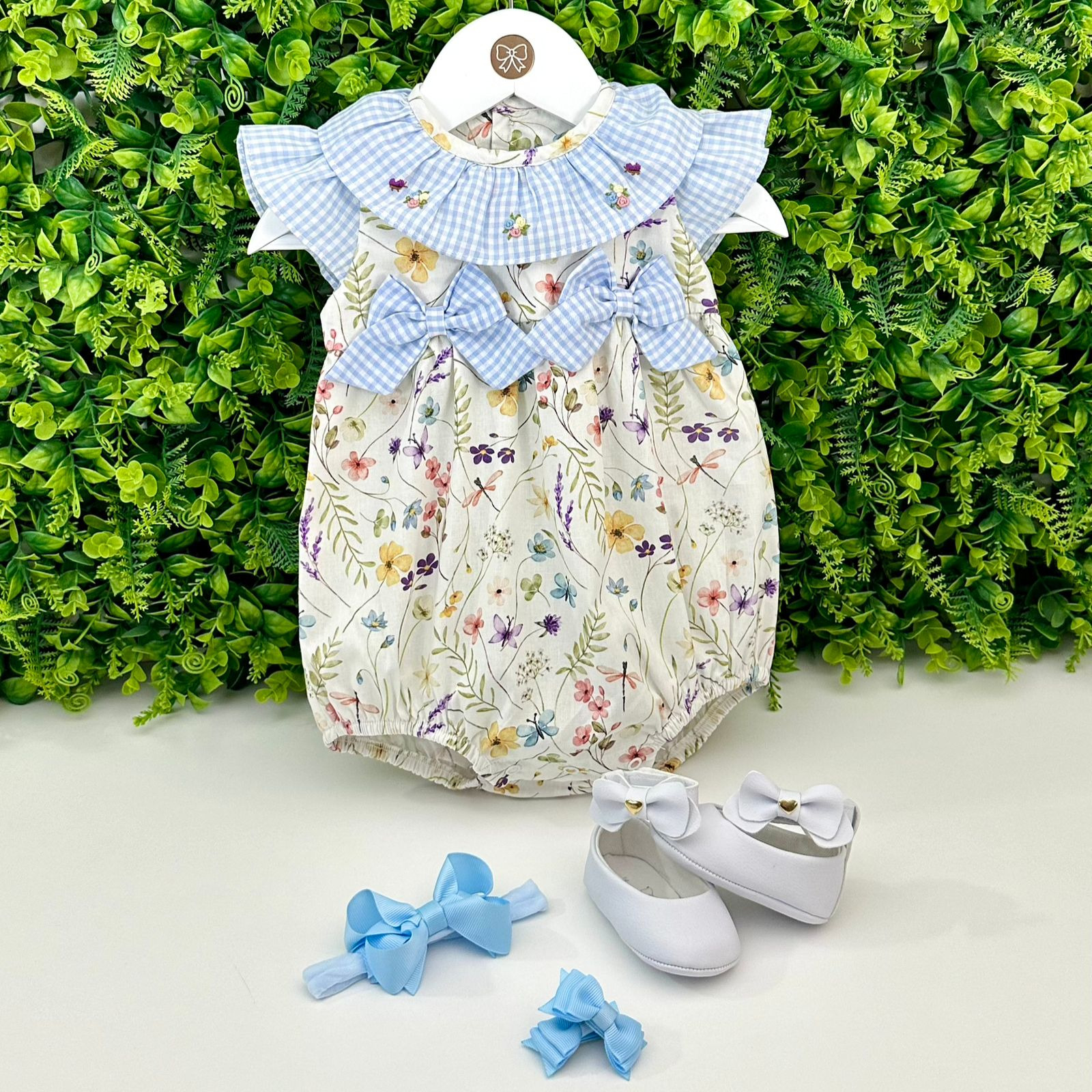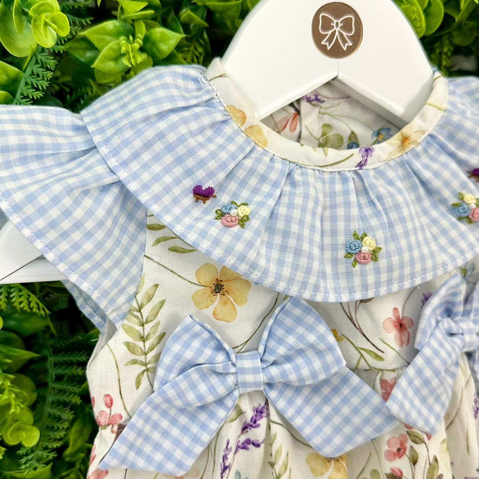 Pimpão confeccionado em tecido de algodão na estampa floral e golinha xadrez azul e bordado rococó