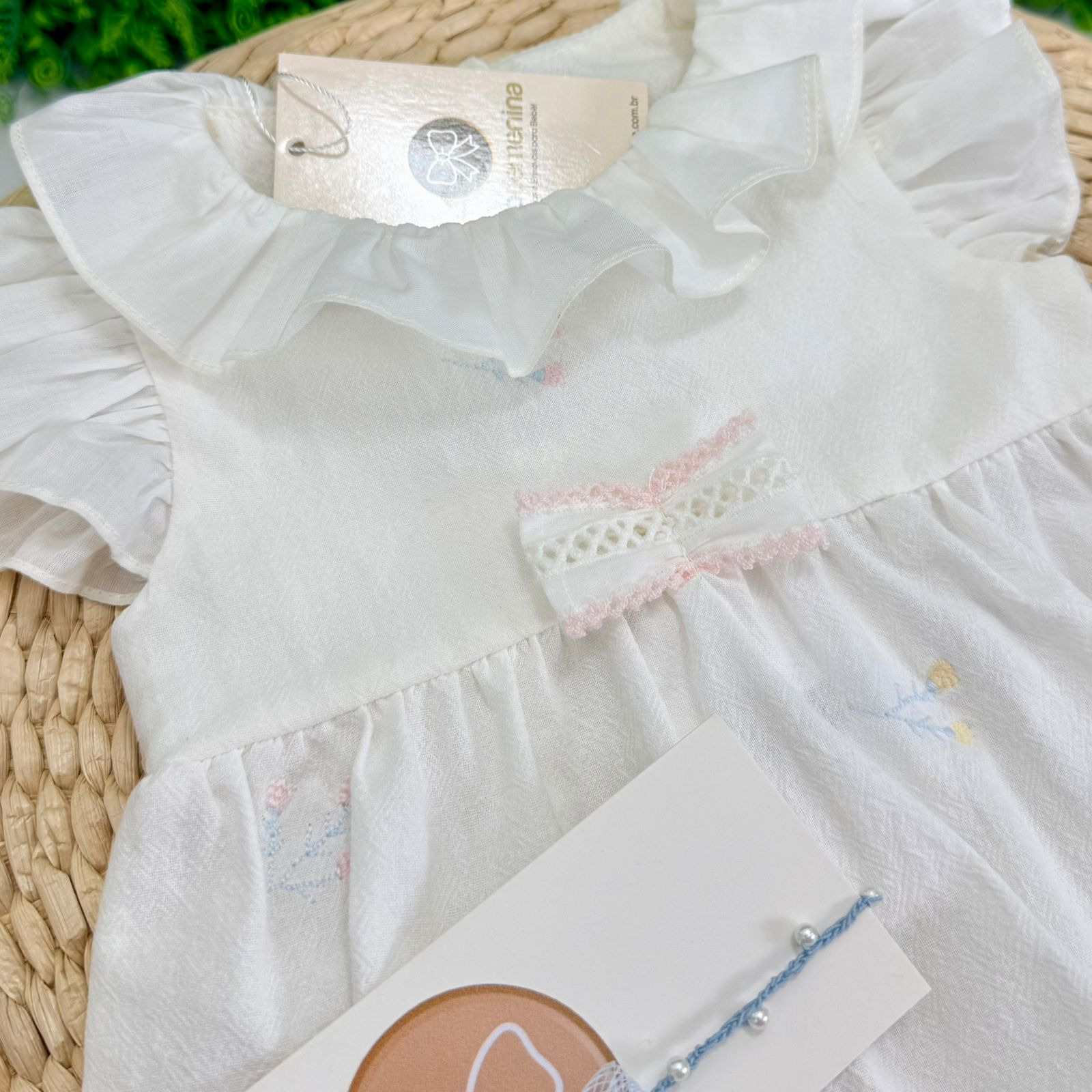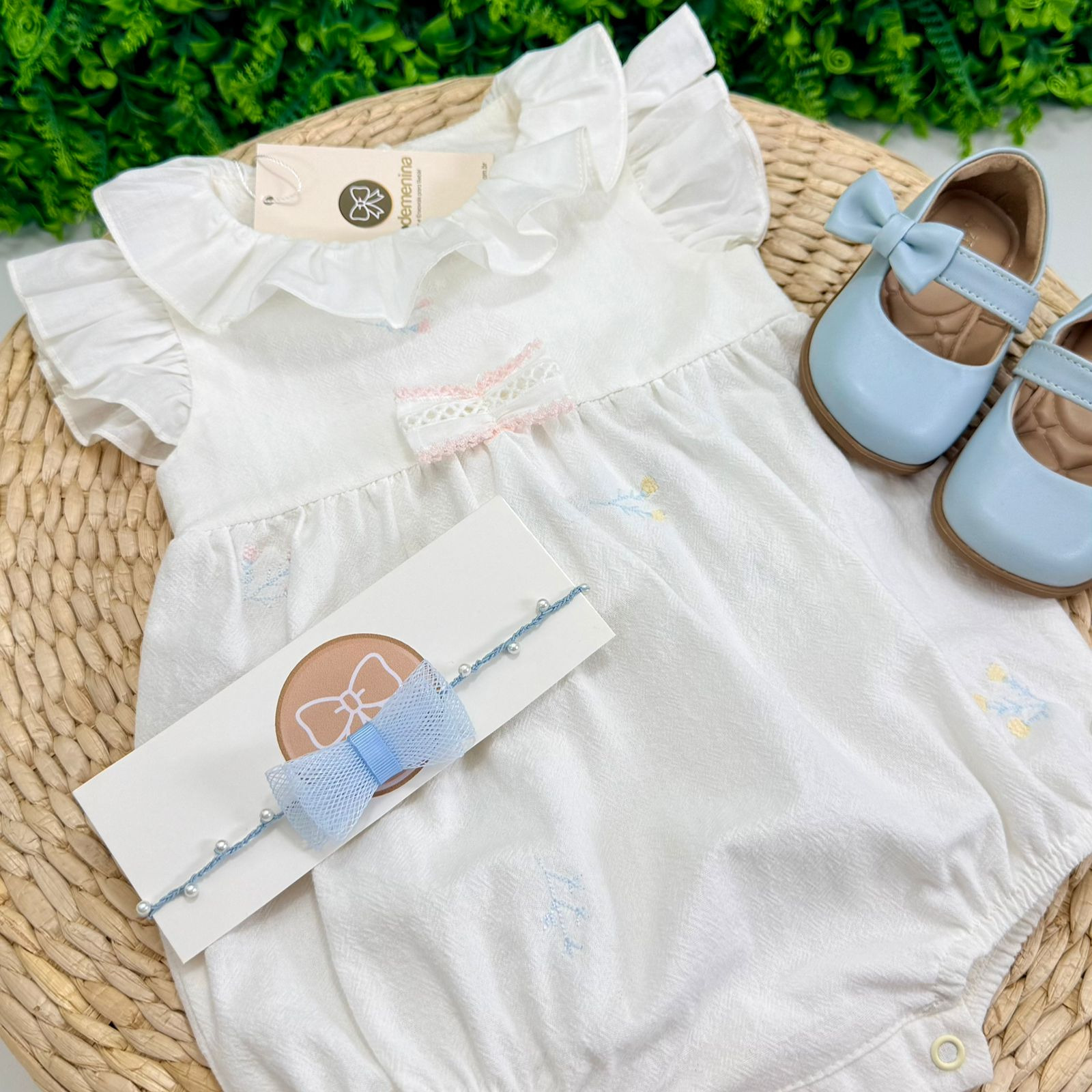 Possui botões de pressão na parte inferior, facilitando o vestir e a troca do bebê, além de acabamento confortável nas perninhas. Os detalhes em azul bebê complementam o visual com doçura e elegância, tornando o pimpão ideal para momentos especiais.
