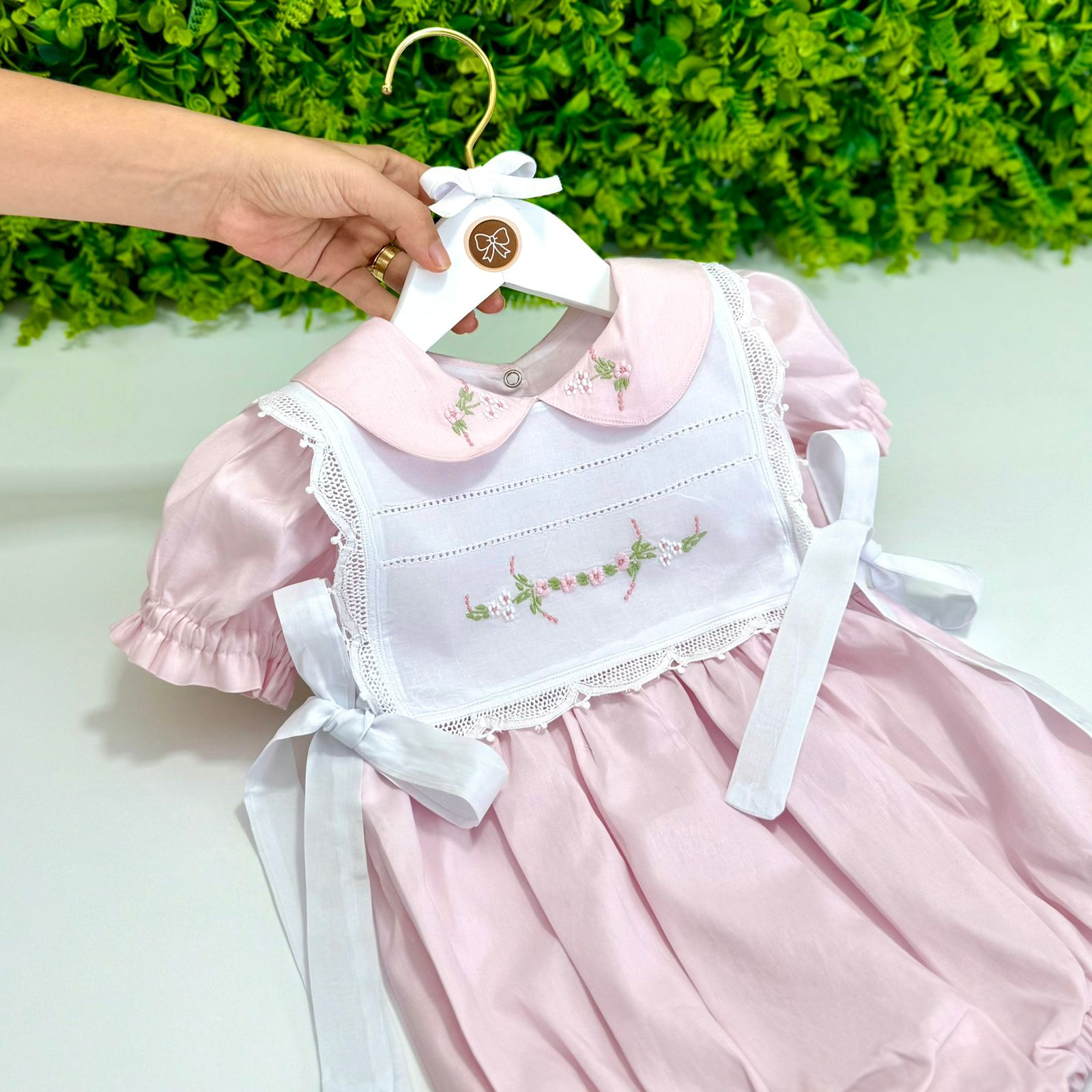 Acompanha um babador removível em tecido branco, com bordados florais combinando e acabamento em Renda Renascença, que adiciona um toque clássico e sofisticado à produção. Ideal para aniversários, visitas especiais, ensaios fotográficos e passeios, este pimpão une delicadeza e praticidade.