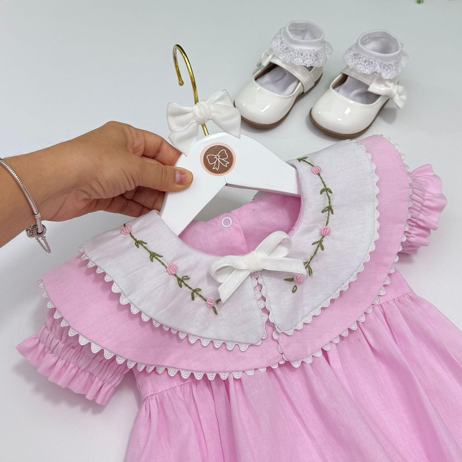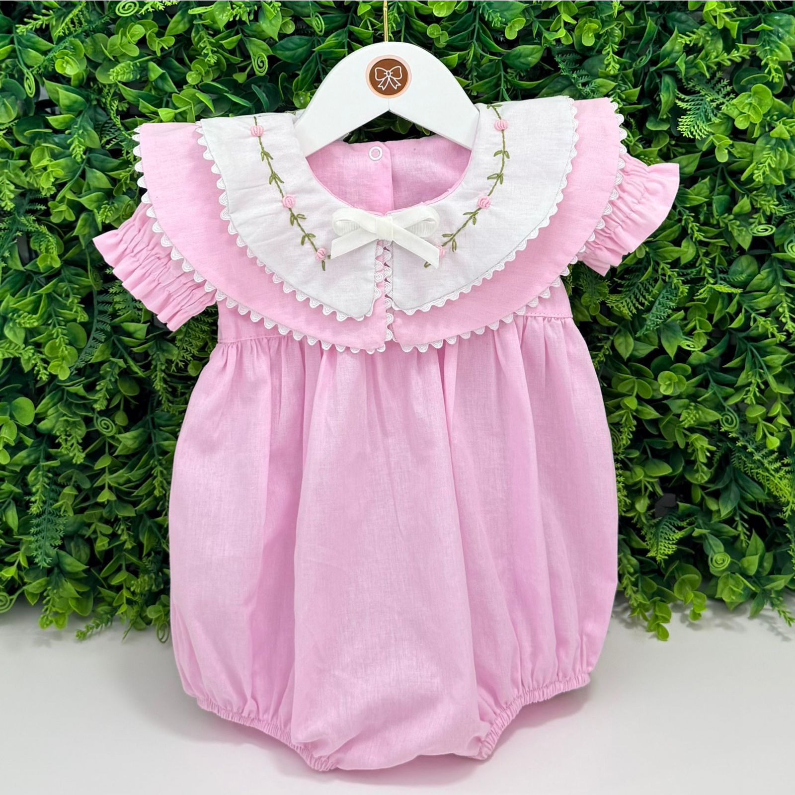 Encante-se com esse delicado pimpão rosa, confeccionado em tecido leve e confortável, ideal para ocasiões especiais! O destaque fica por conta da gola dupla bordada à mão, com acabamento bordado rococó e um laço de veludo branco ao centro da gola dá um toque clássico e sofisticado.